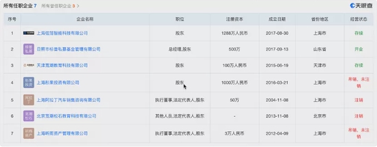 而丁鹏实际控制的7家企业中,上海彤果投资有限公司、北京宽潮松石教育科技有限公司、上海阿拉丁(66.450, -0.23, -0.34%)汽车销售咨询有限公司、上海听雨资产管理有限公司4家公司也都已经注销。