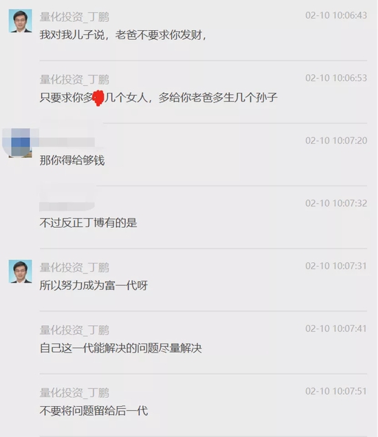先看一下大致内容,丁鹏在群聊中称,“我对我儿子说,老爸不要求你发财,只要求你多X几个女人,多给你老爸多生几个孙子。”