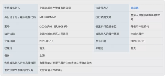 资料显示,兴盾资产由于涉及拖欠薪酬等诉讼,已经于2020年10月被上海市浦东区人民法院列为失信被执行人,其实控人吴凤娥也被发出限制消费令。