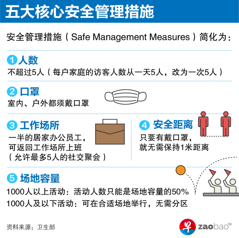 抗疫跨部门工作小组早前制定了“安全管理措施一至五”(SMM1-5),通过调整社交人数、戴口罩、工作场所限制、安全距离,以及活动人数,把现有的各项安全管理措施化繁为简。例如家庭可接待的访客人数可放宽到每次最多五人,而不是目前的每天最多五人。