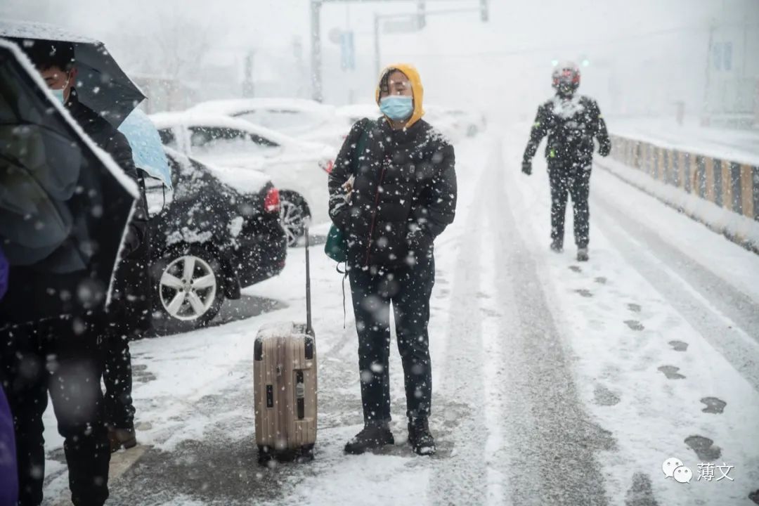 站在风雪里一动不动排队的他们,大多衣着单薄,因为一周前当他们离开燕郊时还是春风和暖的天气。此时他们拖着箱子,提着包袱,拉着宠物笼子返回燕郊,他们本打算在北京住一段时间。在排队的几个小时里,他们头顶的积雪被体温融化又被寒风冻成了一块冰。他们的雨伞过一会就会变沉,要不时弹落上面积雪。下午三点多雪忽然大了,他们从箱子里取出塑料袋搭在头顶挡雪,取出衣服裹在头上当帽子,把褥子裹在身上保暖,把床单撑起来当屋顶,几个人蜷缩在下面。一个穿着短裙的年轻女人和同伴依偎在一把伞下。有的人用纸箱的瓦楞板搭在头顶挡雪。一位女人一只手领着小孩,另一只手提着大大小小的袋子,袋子上面写着“人民好品”。有留言说,他们的确都是品行良好的人民。他们给家人朋友打电话,手机屏幕被雪打湿,手指被冻得通红,身体发抖让声音也在颤抖。一个人把几天前带出来的一桶花生油放在地上,油凝固成蛋黄色固体。一个女人在排了一两个小时队后,因为衣服穿得太少冷得撑不住,只得放弃,兀自在空荡的路口叫车返回北京。