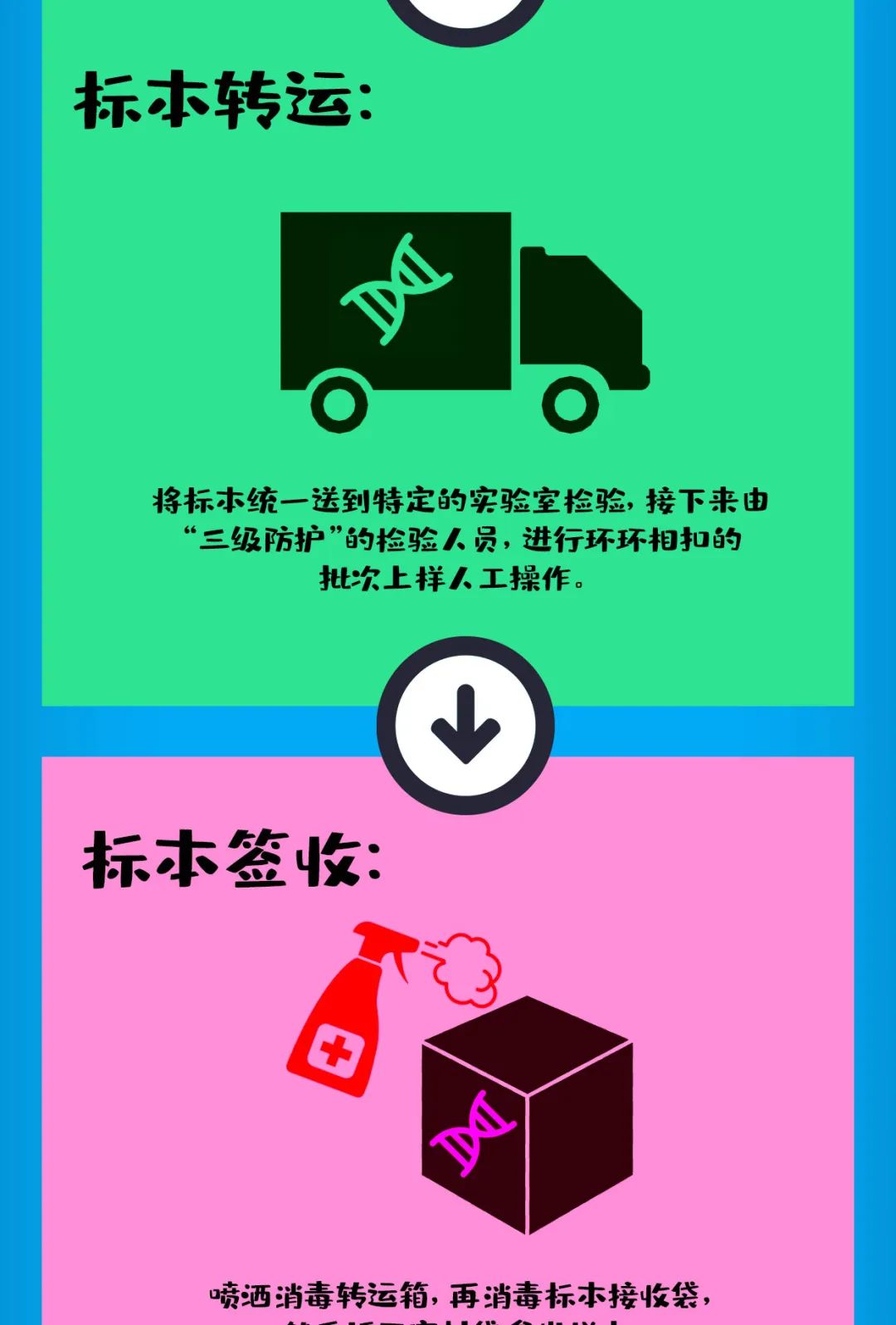 核酸检测样本采集后,采集人员会清点数目,并用密封袋包装好,用消毒剂喷洒消毒,然后放进样本转运箱,由专人送到核酸检测实验室。检测人员收到样本后会先对转运箱消毒,并在开启后对转运箱内壁和标本采集密封袋二次消毒,之后才是拆开密封袋取出样本。