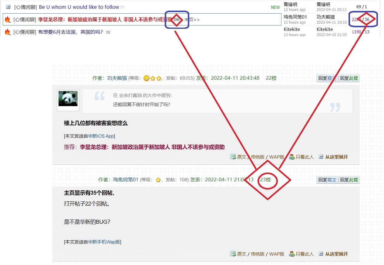 主页显示有35个回帖,打开帖子22个回帖。