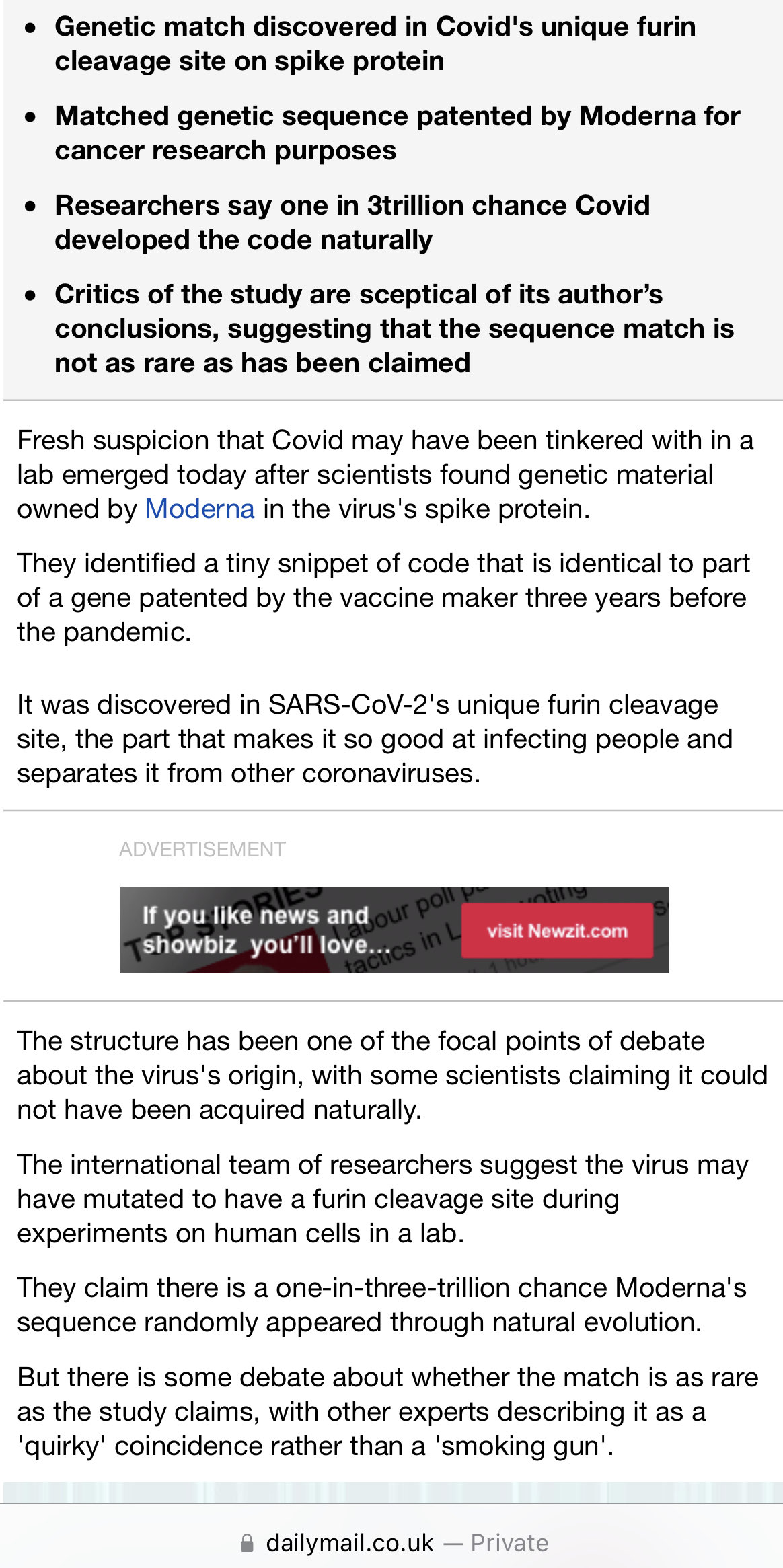 https://www.dailymail.co.uk/news/article-10542309/amp/Fresh-lab-leak-fears-study-finds-genetic-code-Covids-spike-protein-linked-Moderna-patent.html