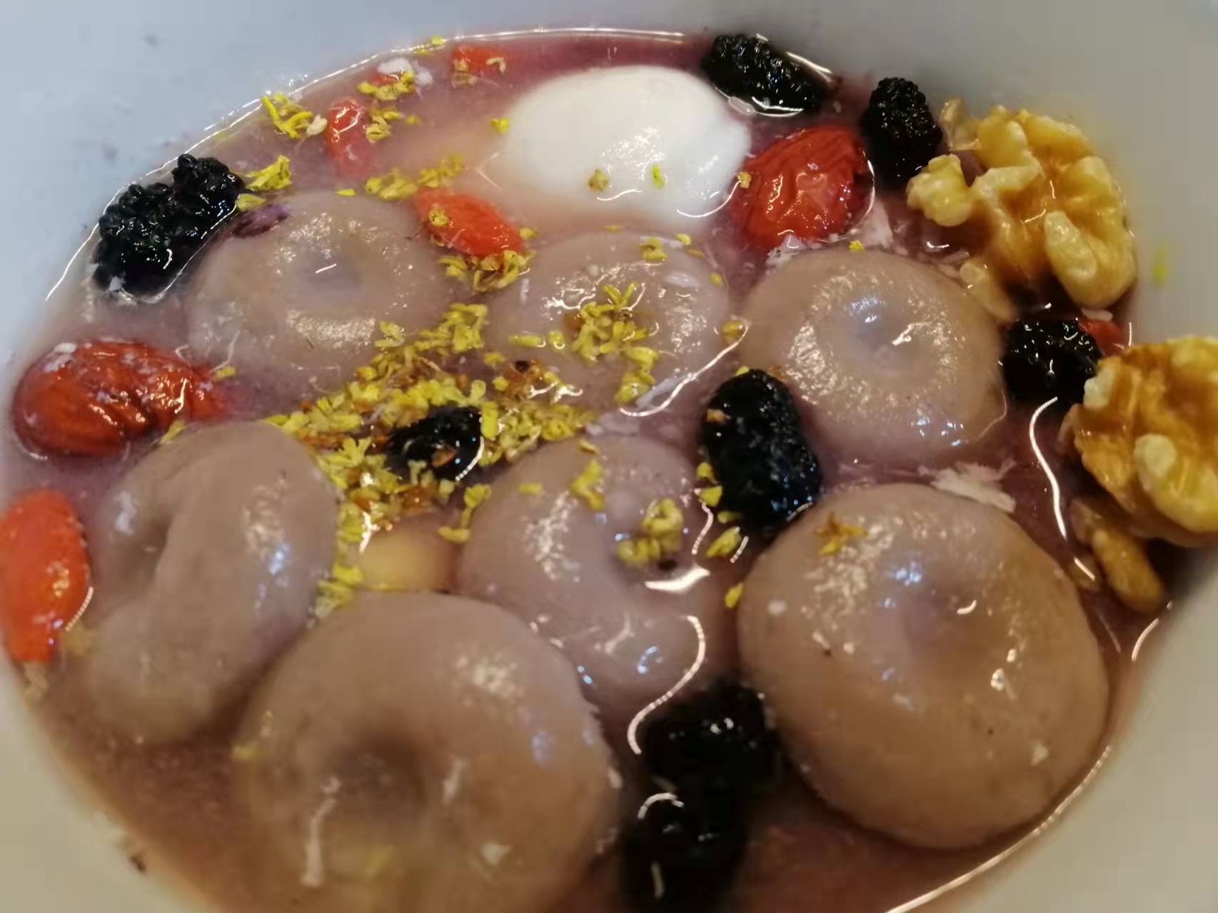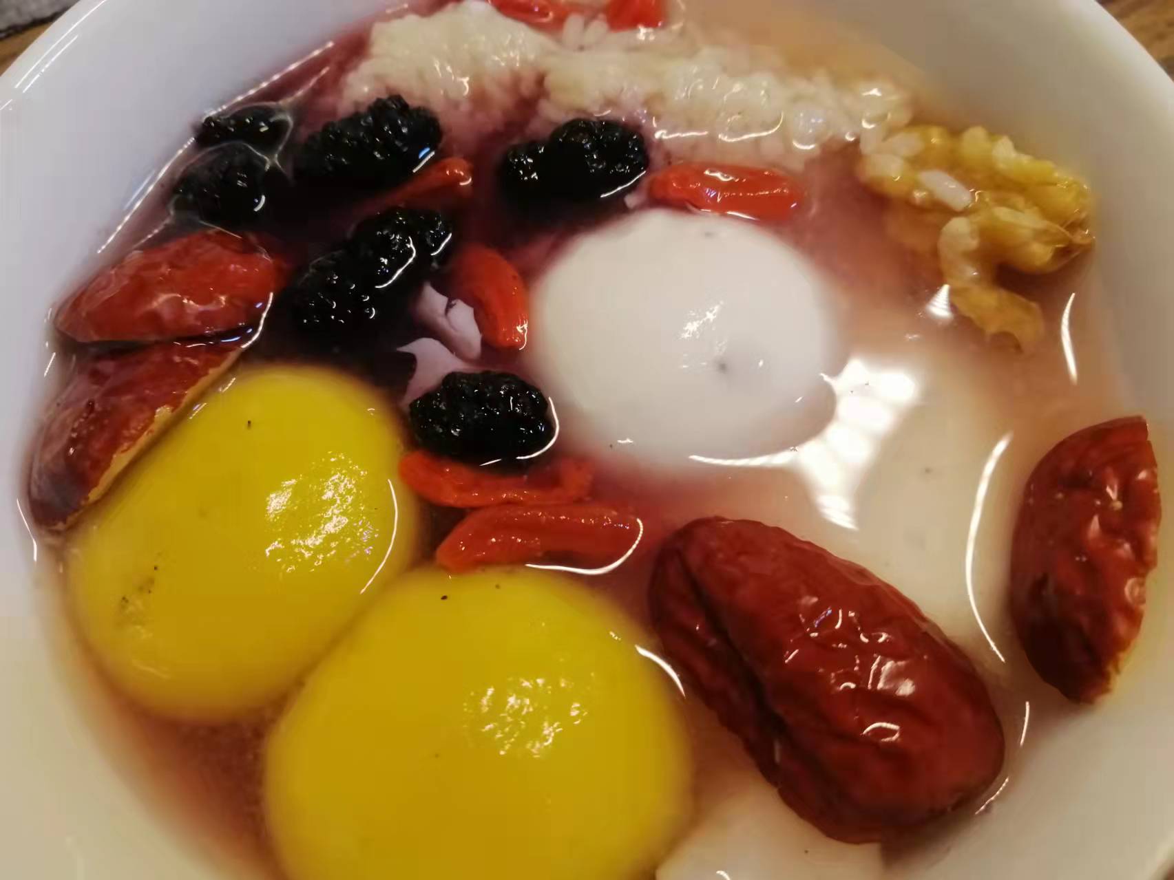 比较喜欢酒酿荷包蛋+核桃+红枣+枸杞+干桑葚 +桂花(可加汤圆或者芋头算盘子)