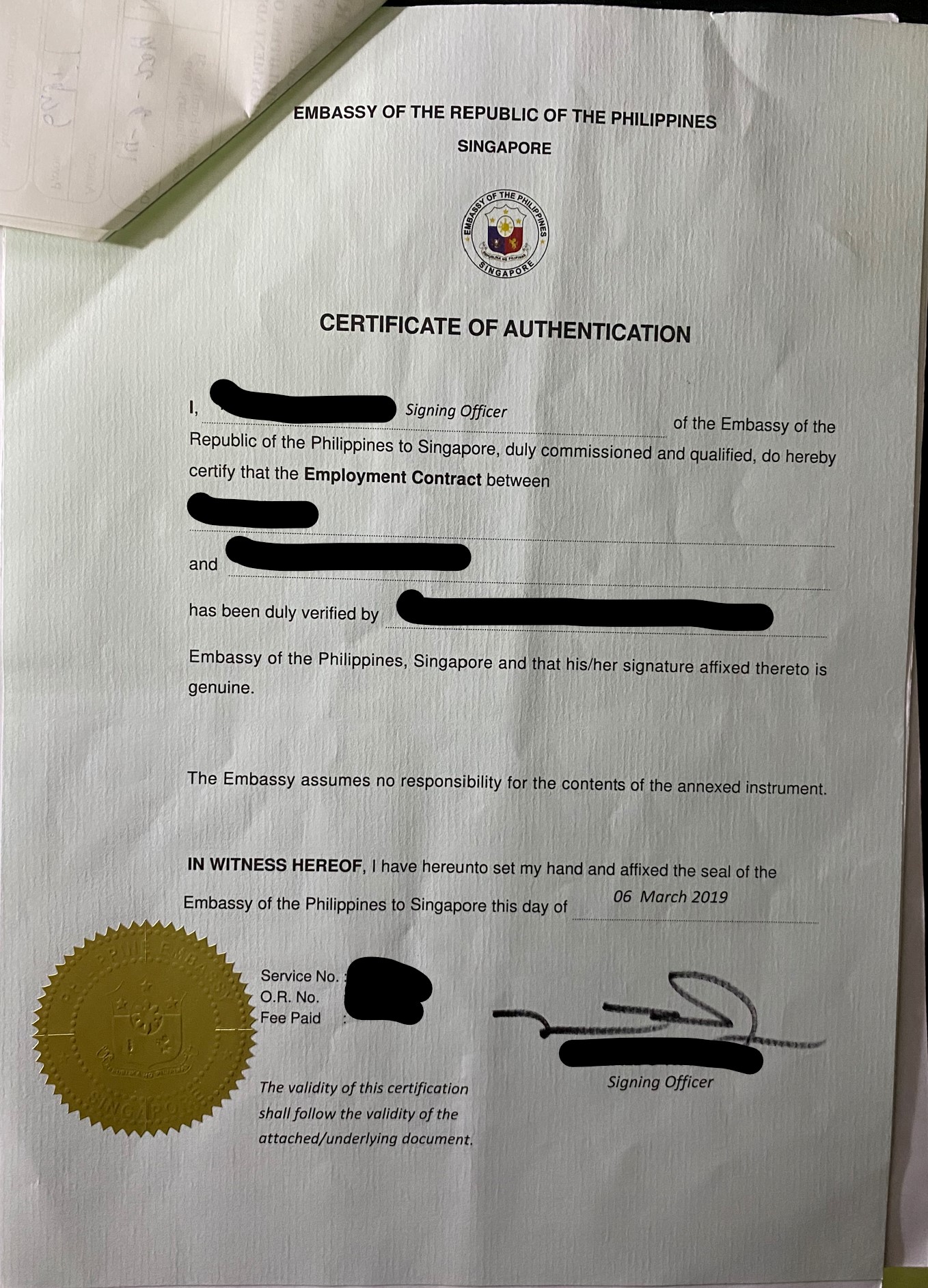 2 certificate of authentication,2 certificate of authentication, 这个估计就是你说的validate the contract. 要搞定这个好像需要standard employment contract(菲律宾官网下载的),还有一个7000块的insurance. MOM的只有5000块,所以自己还要加2000块的insurance。 搞好之后是这样的: