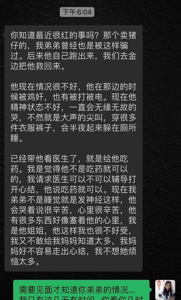 曾经在政府医院担任医生的心理辅导员李姿,目前正在治疗及协助青年走出伤痛及阴影。她在病人家属的同意下分享了与病人姐姐的对话,让民众了解被“卖猪仔”的创伤后遗症是相当严重的。
