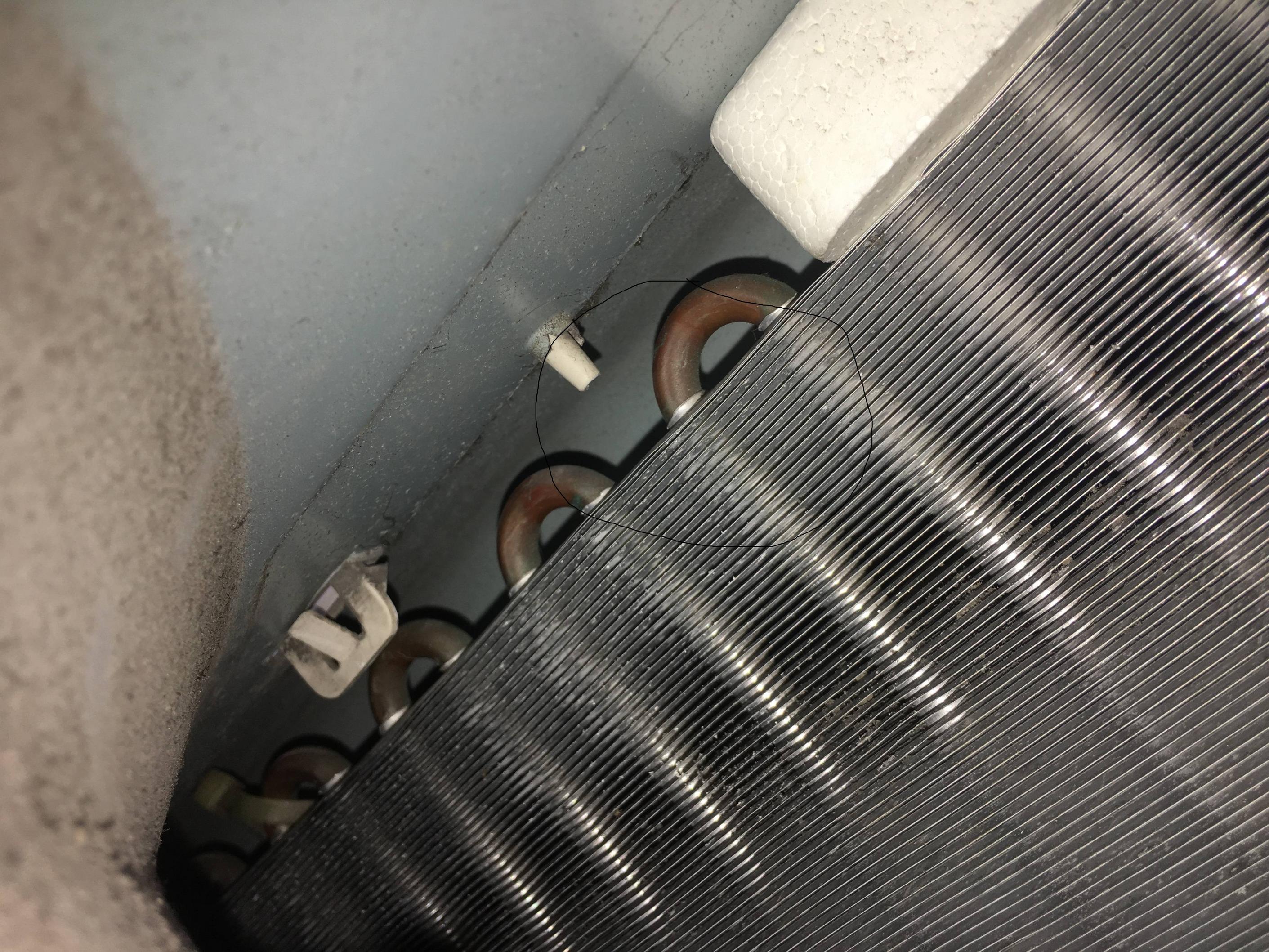 今天维修师傅来加气,刚接上气罐,就听到室外机蒸发器有个地方 丝丝 得往外漏气,蒸发器这个管子有地方漏了(黑圈的区域,用手能感觉到气体向外喷),请问这种情况下还能修吗?空调刚满8年。平时维护得很好还挺新。