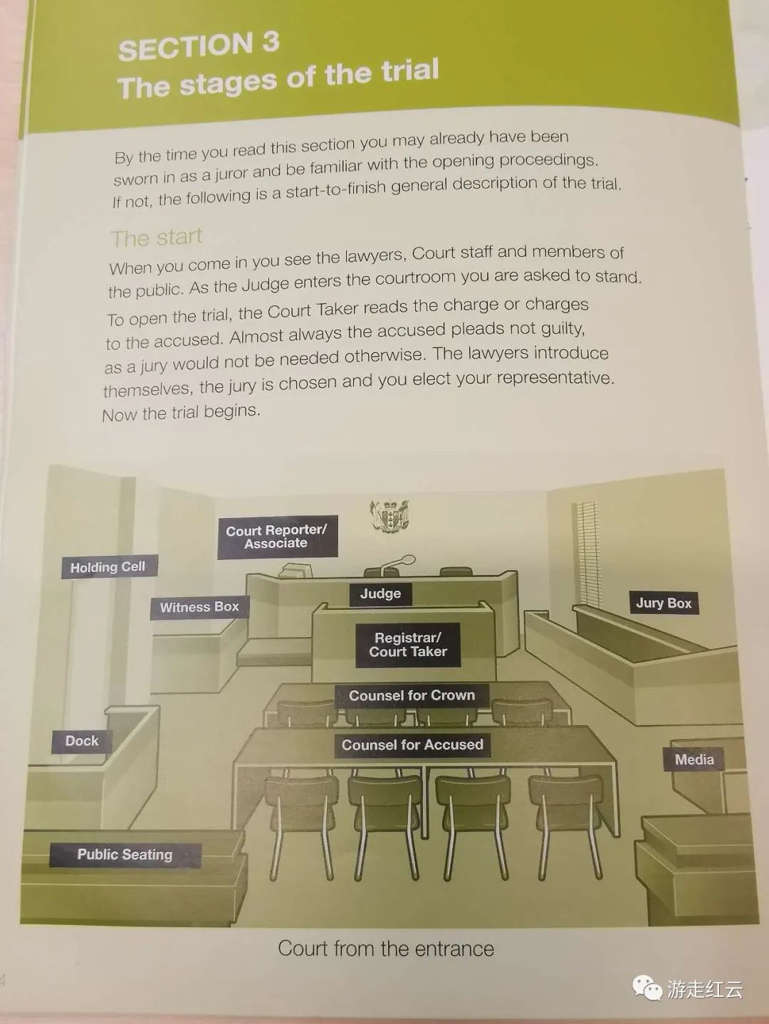 在等待期间,我把 陪审员 手册读了一遍,里面对陪审制度,原则,流程都做了解释。尤其终于让我明白了庭审房间里座位是怎么安排的。因为我一直一头雾水的不知道谁是谁。