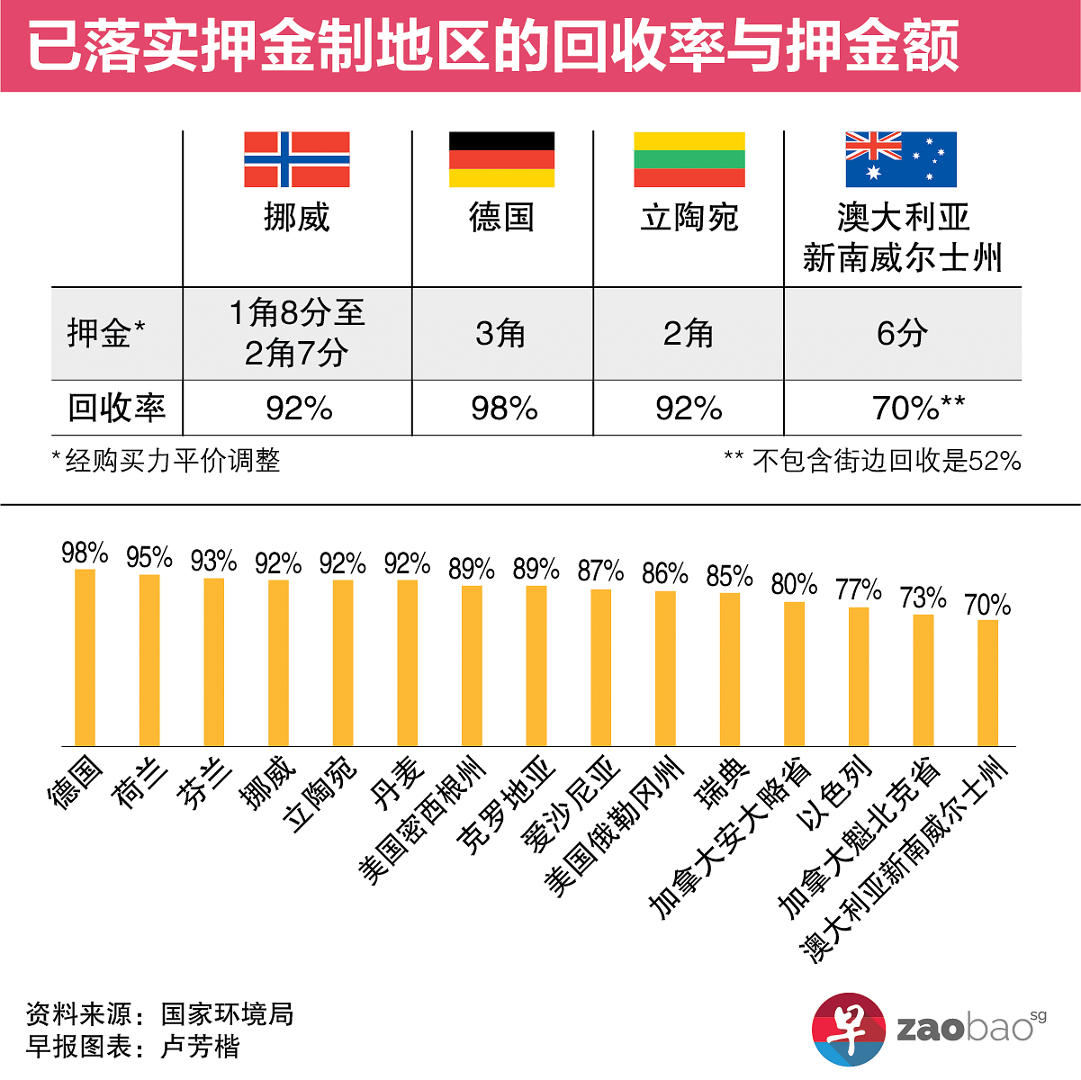 环境局指出,目前全世界有约50个地方包括挪威、德国、克罗地亚及澳大利亚新南威尔士州和西澳等已实行类似计划,并且证实有助显着提高饮料瓶罐的回收率。