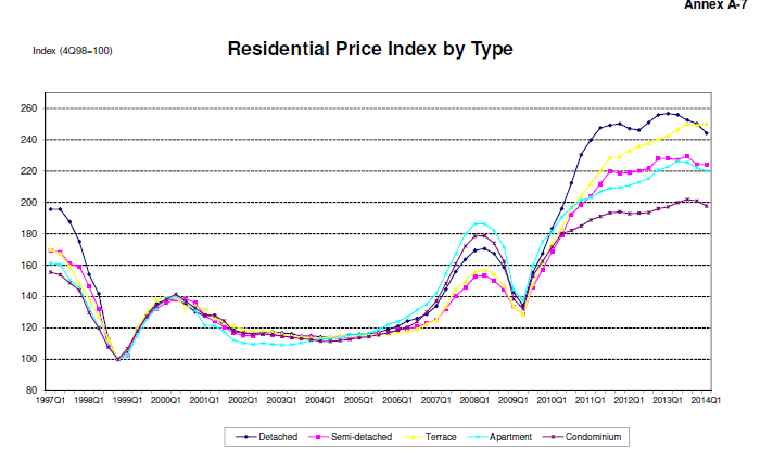 2014Q1私人房产价格的确是在下跌。Core Central Region 降了1.1%,Outside Central Region 降了0.1%,Rest of Central Region 降了3.3%.私人房产的租金也降了0.7%