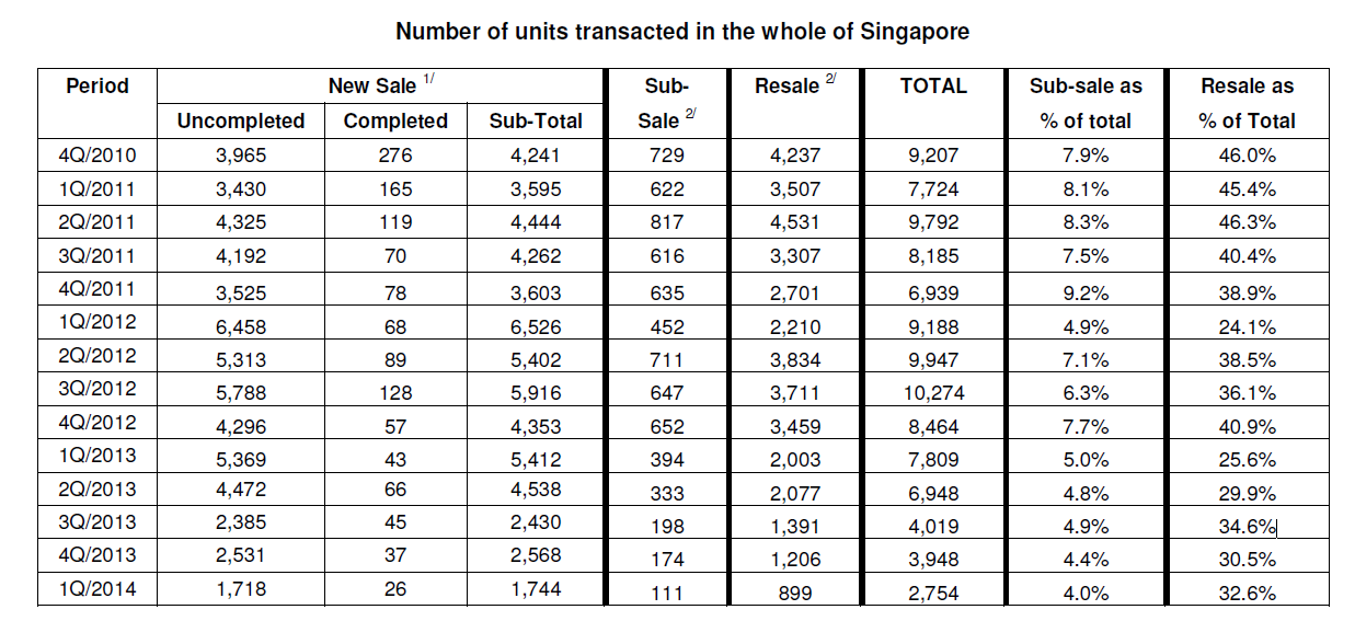 市场交易量也明显下跌。总共2754私人房产卖出,比较起上个季度3948下跌了30%(最高峰2012Q3卖出了10274,现在只有那时的27%)。1744个新项目被卖出。比较起上一个季度的2568少了32%。resale和sub-sale都明显降低。