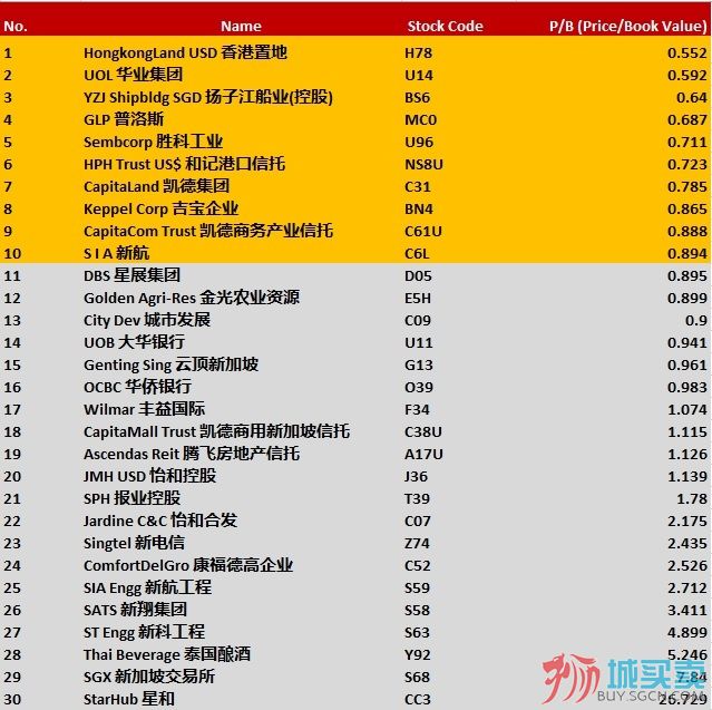 按市净率(P/B, Price/Book Value)给海峡指数30支成分股排排名。看看在前十名的高富帅有哪些吧?