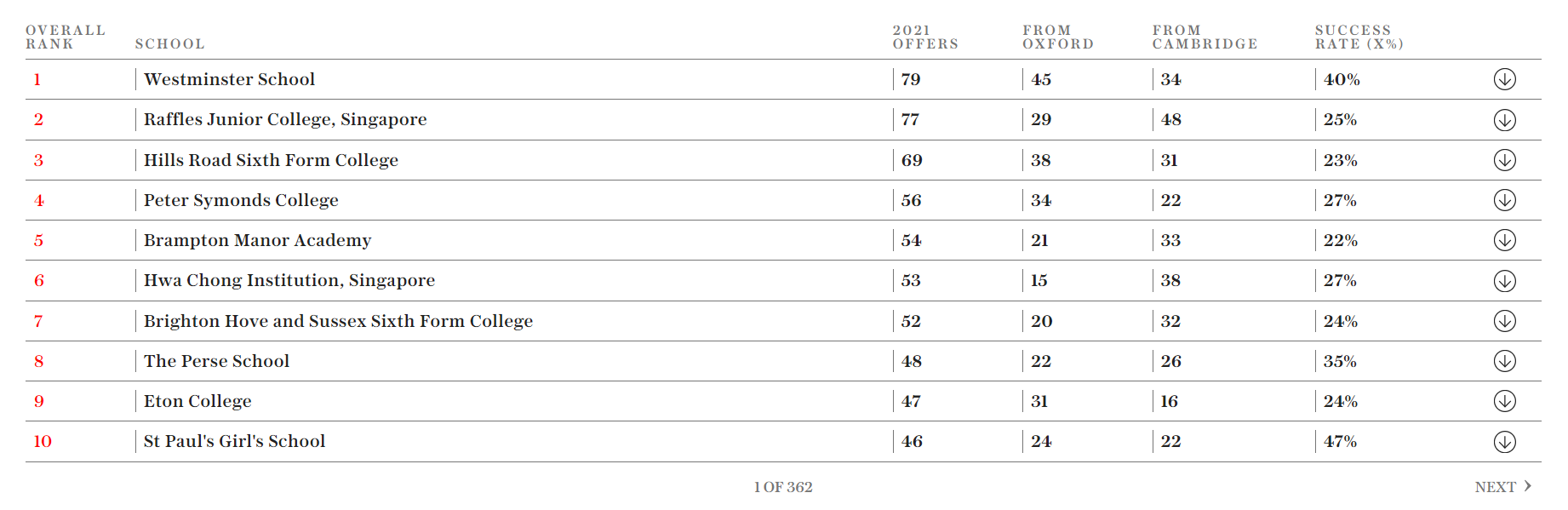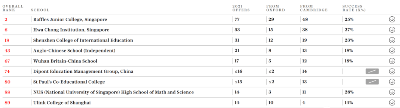 如今,牛津剑桥的录取人数数据终于出炉了,据《每日电讯报》整理的数据,排在前十的学校中,有八所是英国本土学校,而剩下的两所则是新加坡的学校。可以看出,新加坡的莱初实力继续保持在前十之列,不过排名略有下降,与前几年的第一名相比有所不同。