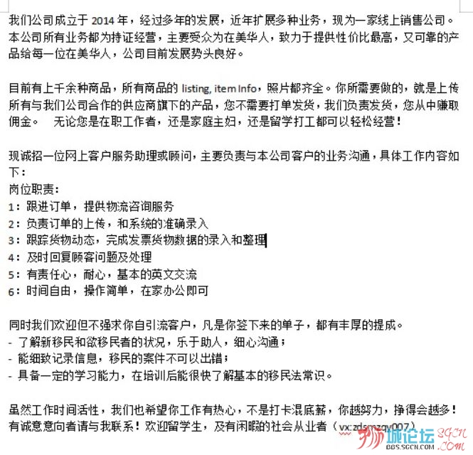 工作简介: 目前有上千余种商品,所有商品的listing, item Info,照片都齐全。你所需要做的,就是上传所有与我们公司合作的供应商旗下的产品,您不需要打单发货,我们负责发货,您从中赚取佣金。 无论您是在职工作者,还是家庭主妇,还是留学打工都可以轻松经营! 需要兼职人员具备: 1、自备帐号 (购物帐号方可) 2、有电脑丶网络,上网方便 3、有良好的沟通能力;- 英语丶国语 4、必须要有责任心和上进心 有任何问题及时联系我处理 (本文长期有效)非诚勿扰微信:zdsmzqy007