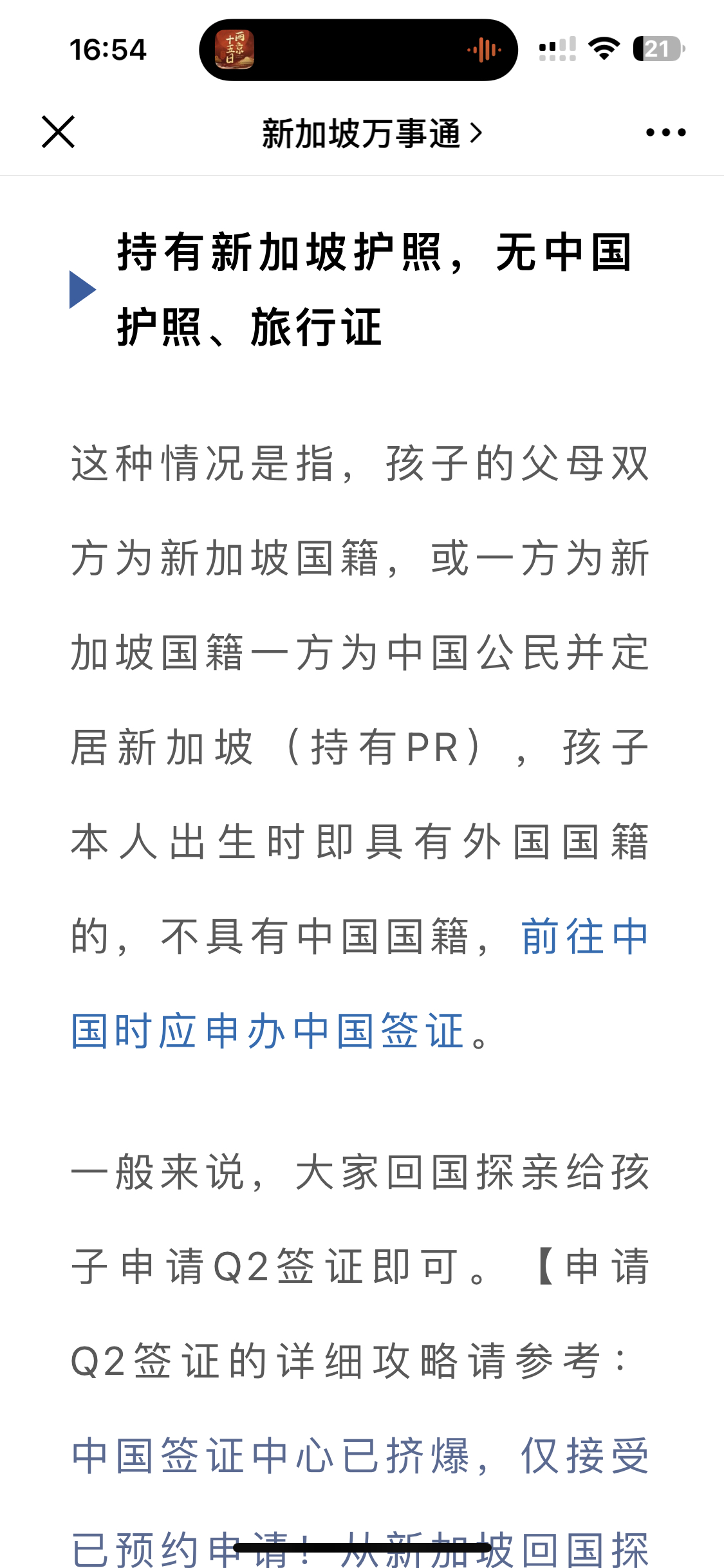 火凤凰001 • • 178 次浏览给娃办签证,孩子出生时为 新-加-坡-公-民,父母一方为中国籍。到签证中心办理签证,被要求出示出生证明,显示父母一方为中国籍,遂被要求去大使馆办理。但大使馆是办理护照/旅行证的,旅行证的办理前提是孩子为中国籍。难不成孩子四岁了,还能去大使馆补一个中国籍?