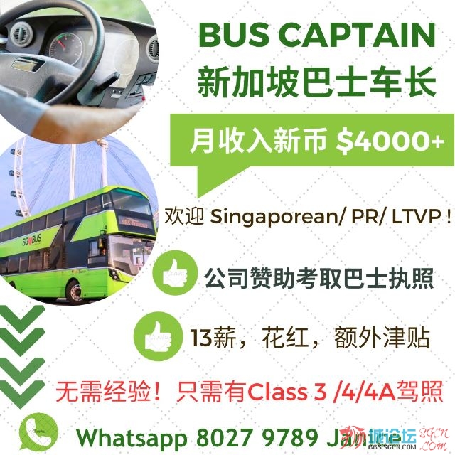 【招聘】新加坡巴士司机 100位*公司赞助考取巴士驾照工作地点:全岛工作时间:轮班制底薪:$2180 (有经验会调整)福利:- 提供13薪- 表现花红额外津贴:- 维持安全驾驶,无交通意外,每个月额外$100- 无故障事故/事件,驾驶150小时,每个月额外$130- 轮班津贴 $11/天- 驾驶2趟不同路线以上 $2/天- 驾驶双层巴士 $6/天- 驾驶第一班/末班车工作班制:早班:早上4-5am 开始 到下午2-3pm午班:下午2-3pm 开始到凌晨分班:早上5-6am 开始到中午11am – 12pm,或者 下午3-4pm开始到晚上8-9pm工作要求:-需有3号/4号/4A 驾照有兴趣请联系 Janice 安排面试