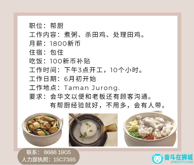 看到您的帖子了,您是在招聘马来西亚帮厨啊。这个岗位还不错,包住,底薪也有1800新币和餐饮补贴。我知道这个工作可以帮助很多有需要的人,特别是那些在新加坡学习的学生们。
