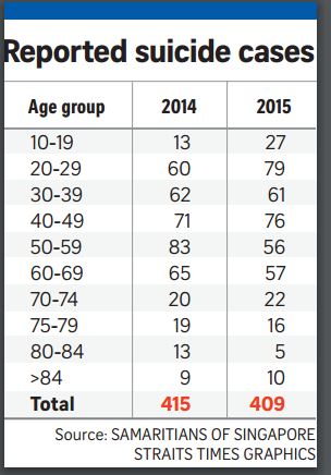 根据2016年7月26日海峡时报的报道,去年的10岁至19岁年龄层的青少年有共27人自杀,这是过去15年来最高的记录。相信这群自寻短见的青少年多数是在籍学生。