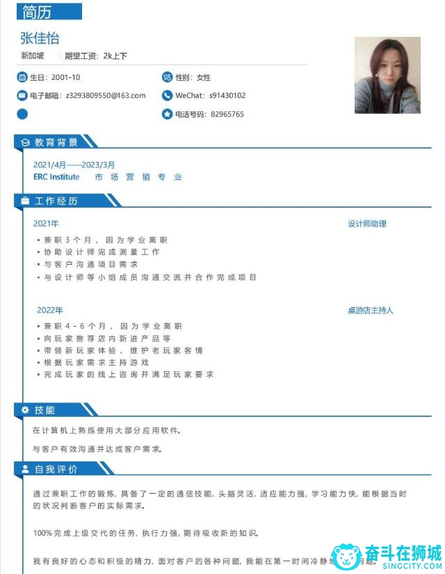 本人女,今年22岁,中国人。曾经有销售方面的经验,学习过设计软件的使用(CAD,SketchUp,Revit等),熟悉电脑办公软件(Word文档,Excel,PowerPoint等)财务做账软件。肯吃苦,学习能力强,性格随和,处事圆滑。目前在新加坡,收到消息后就可以进行面试。需要公司帮忙申请工作准证。邮箱号码:[email protected]号码:s