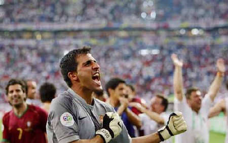 这些日后再谈,让我们先回到比赛。一边是不得不以10人应战的英格兰疲于奔命;一边是士气大振的葡萄牙大举进攻;瑞典主帅埃里克森立刻码出铁桶阵予以应对,难看但是奇效,不管被迫摆出多少种体位来承受多少次撞击——好歹就是没让葡萄牙射进。下半场打平了打加时赛,加时赛打平了进点球战。说到点球,两周前埃里克森本还在暗暗高兴,心想这下可以跟荷兰角逐一下谁才是世界最烂点球队。没想荷兰这么怕输,居然以死避战,葡西一战一结束,埃里克森立马带着大英回家狂练点球。遗憾的是,狂练也没用,世界最烂点球队就非英格兰莫属了。英格兰球员集体患上了一种叫“在俱乐部我点球像德国一样精准,在国家队我点球比荷兰还要傻逼”的怪病。
