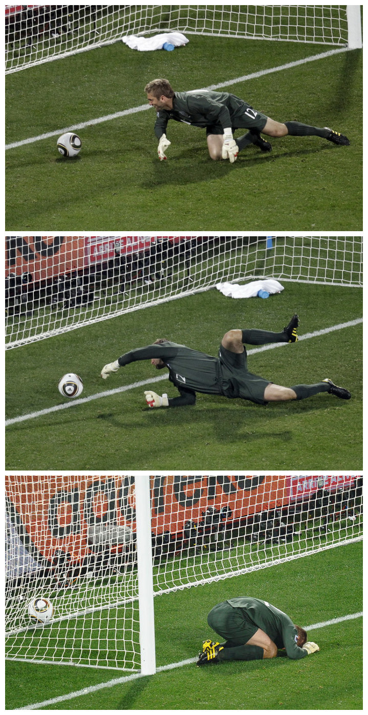 因为08年欧洲杯的奇耻大辱,2010年出现在南非的英格兰,那叫个低三下四,低眉顺眼。卡佩罗来了,他说他会解决好双德问题,地位低下的英迷甚感欣慰又不敢声张。解决好双德问题?那是能走多远? 八强? 四强? 哦不不不,亚军我们可不敢想。还记得《世界杯篇·英格兰这支国家队(上)》 中我们提到英格兰首届世界杯之旅落败美国吗?大屌丝美国,大联盟养老。时隔56年,英格兰还是干不过美国。全欧洲队的好朋友英格兰门将以一个震惊世界的黄油手送给美国一个大礼,愣是把1:0追成 1:1。