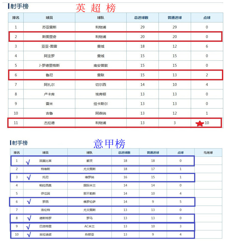 比射手,意甲射手前十位中有6个是意大利本土球员,进攻火力点人才济济,而英超射手榜的数到第三个英格 兰籍射手排在了11位踢出10个逆天点球来凑数。