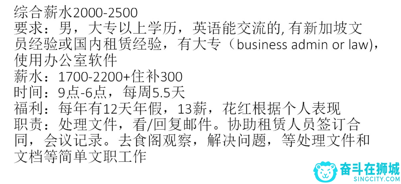 连锁食阁文员综合薪水2000-2500要求:男,大专以上学历,英语能交流的, 有新加坡文员经验或国内租赁经验,有大专(business admin or law),使用办公室软件薪水:1700-2200+住补300 时间:9点-6点,每周5.5天福利:每年有12天年假,13薪,花红根据个人表现职责:处理文件,看/回复邮件。协助租赁人员签订合同,会议记录。去食阁观察,解决问题,等处理文件和文档等简单文职工作