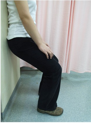 如图,身体靠墙,两腿分开距离比肩膀稍宽,双膝弯曲下蹲,小腿和身体保持直立位,角度不宜太深 (否则就用不到股四头肌了),45度左右为宜,蹲到不能坚持为止。两次下蹲之间休息一分钟并放松肌肉,不要休息时间太长。接着练习第二个静蹲。每天做 5 组左右。