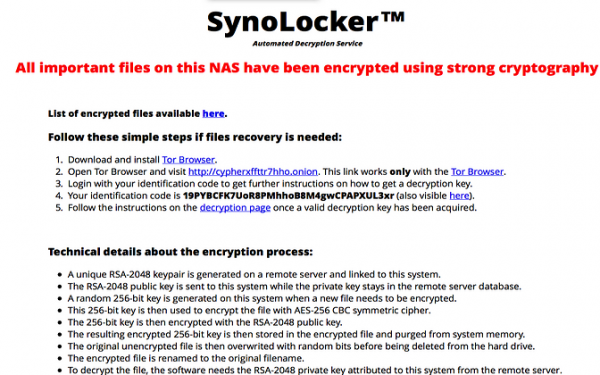 功夫熊猫 • • 63568 次浏览这几天出现了一个针对 Synolgoy NAS 的恶意软件,名叫 SynoLocker。这个程序会利用未知的漏洞入侵 NAS 后,将所有 NAS 内的档案加密,并且要求使用者付出 0.6 比特币的赎金(约2200元)来取得解密密钥,否则就无法恢复 NAS 内的档案。