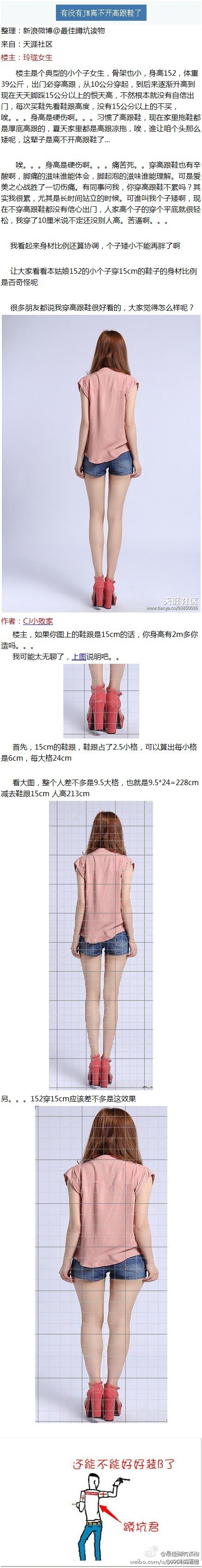 冰是睡着的水 • • 62897 次浏览天涯有位楼主发帖【有没有JM离不开高跟鞋了】说自己身高152cm,出门必高跟,非15厘米的高跟鞋不穿。网友说这样像踩高跷一样,比例会奇怪。楼主不服,上图说明自己矮归矮,比例是很赞的!谁知,帖子里出现了一位技术帝