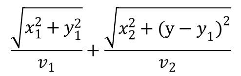 假设你在往北与往南的人潮中移动的最快速度各自是v1与v2,往北与往南的人群宽度告自是x1与x2,在往北人群里往北移动的距离为y1,广场南北的长度是y。利用三角形斜边长为两边平方和开根号,移动时间为移动距离除以移动速度,我们可以算出移动所需的时间为