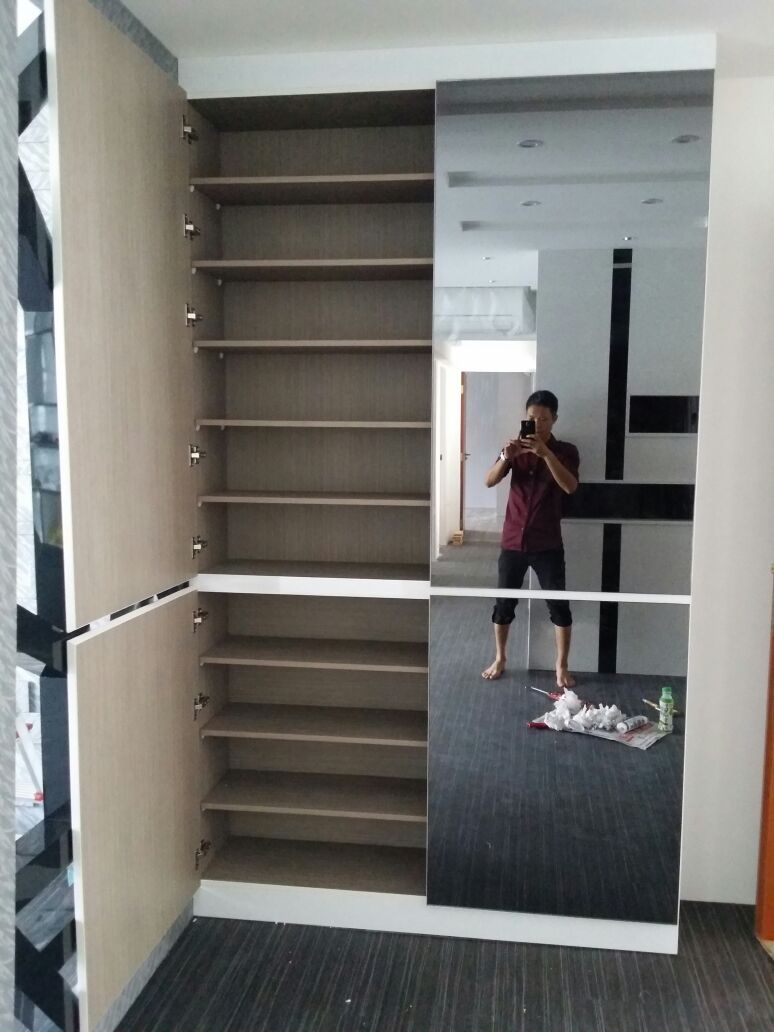 进门鞋橱,一边laminate,一边黑镜子