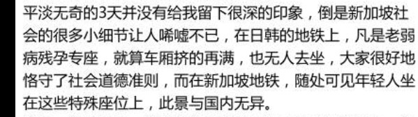 小寒 • • 62315 次浏览今天看到微博上一人的帖子,说新加坡的老弱病残座,年轻人都会去坐,而在日韩没人会坐。