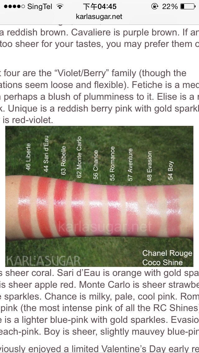 根据上图的60号叫antigone.@南瓜同学推断应该是Chanel Rouge Coco Shine系列的44和46号。看试色是46更橘一点。