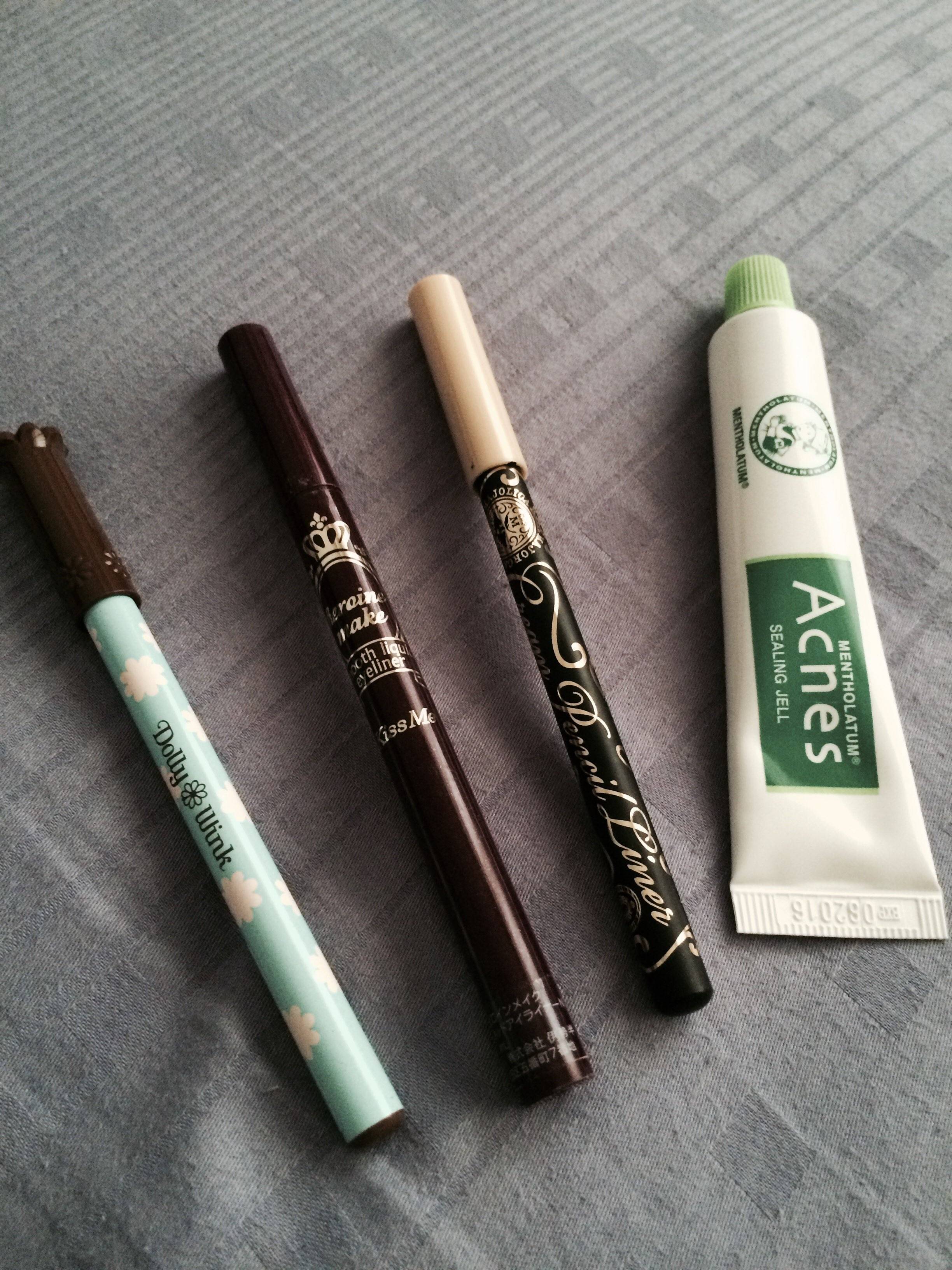 眼线笔 打包10块dolly wink和恋爱魔镜的都是今年买的,打包送kiss me 眼线液,手残星人总化到别的地方。。。很少化妆了,也闲置了。那个曼秀雷敦是凑热闹入镜的。不出哈~
