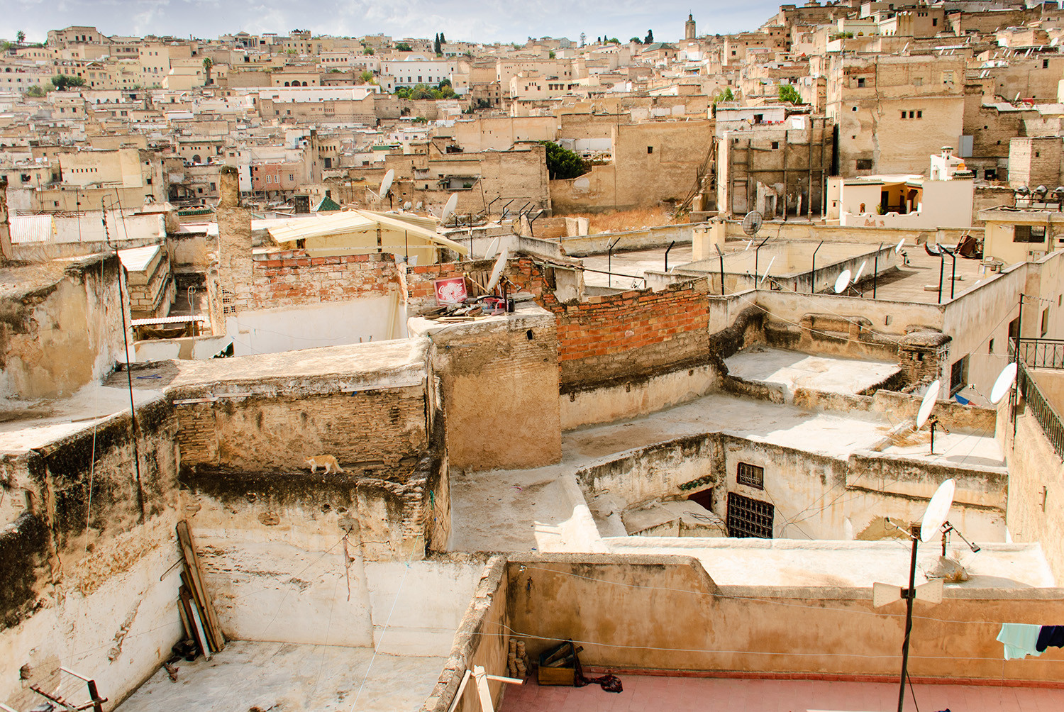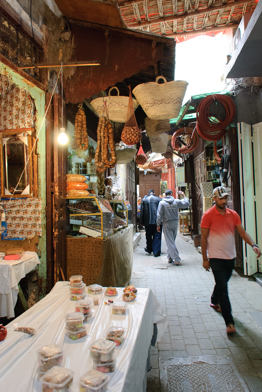 Fes的Medina是个超级拥挤的地方,泥和石头砌的房子,被小摊占满的街道,随时会冲出大笑的小朋友的小巷,破旧的窗户,雕花的大门,所有的一切都好像被机器压过,变成了一块压实的方块,从外面看你连条缝找不到,但是走进里面却是一片生机勃勃。就这样,2800年的时间只是把Fes洗刷的又硬又亮,好像什么都没变过。