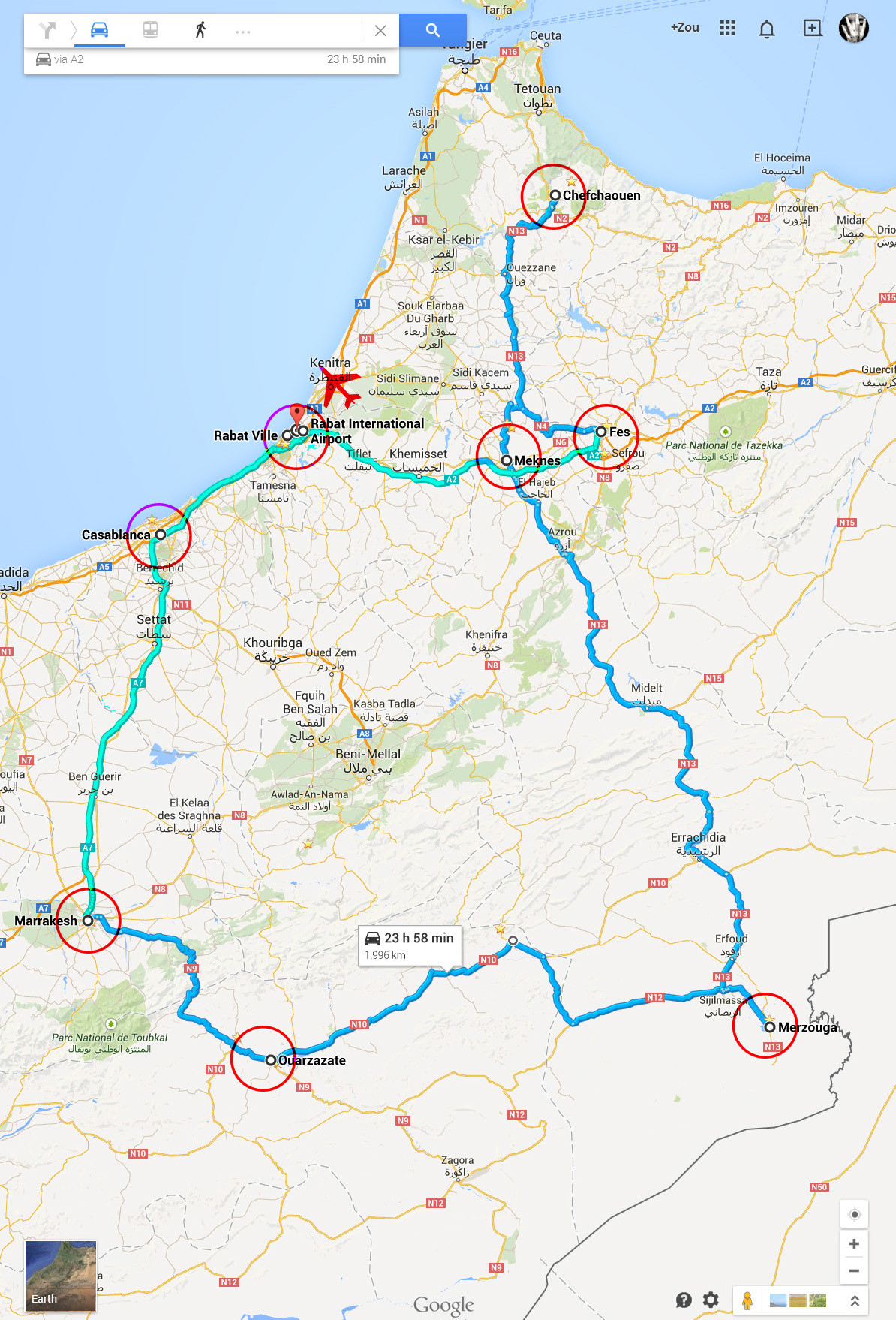 等看了一些游记,在google map上拖划了一阵,才对摩洛哥有了个大概的了解。这次摩洛哥之行一共计划了八个点,花了7天时间,绕了这个国家一个不大不小的圈:
