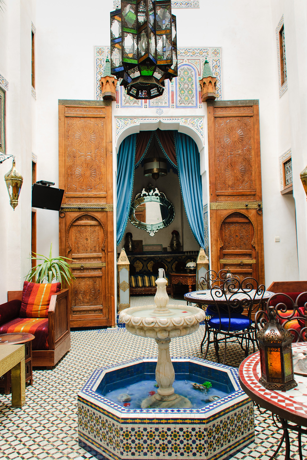 我们这天的住处叫做Riad,可能翻译成客栈比较好,这种客栈一般都是从传统名宅重新装修而来,保留了传统的四方楼加中间天井的结构,又配上了方便客人的洗浴间和无线网络。总的来说摩洛哥各处的Riad都蛮不错。建议找一个对来说比较高的Riad,这样在它的顶楼就能看到整个Medina美景。