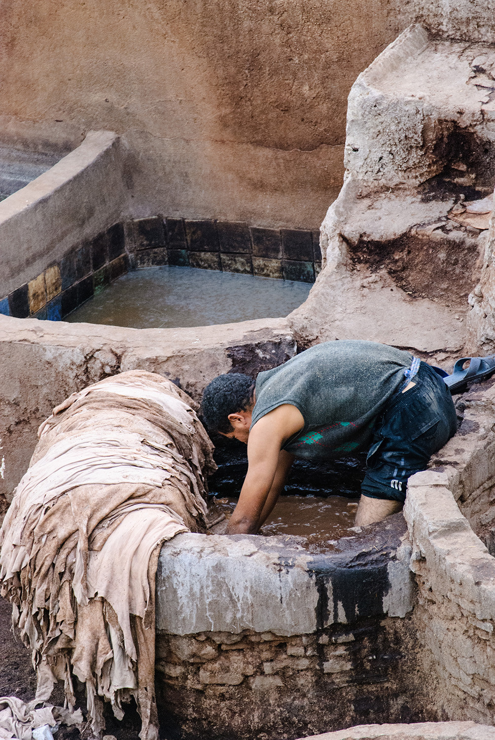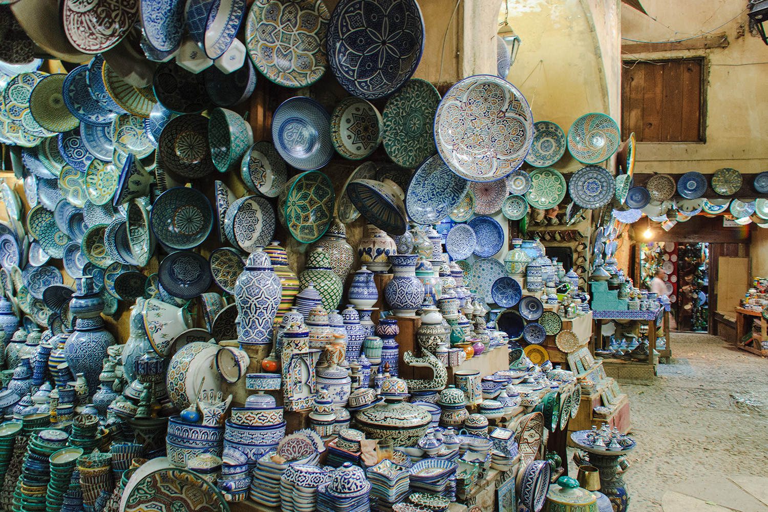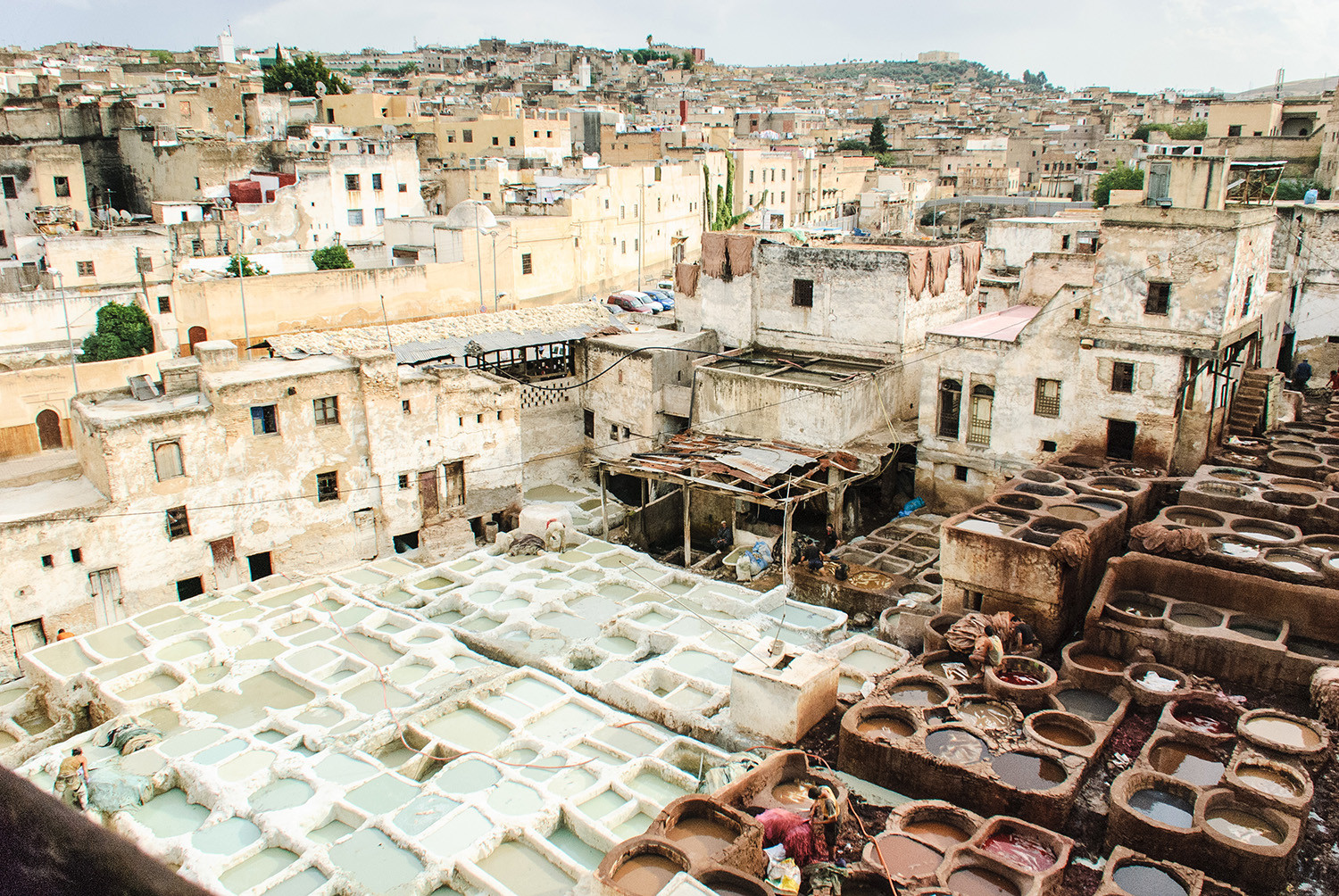 Fes最有名的要算它的手工艺品和皮革制品。Fes的人总是号称摩洛哥其它地方卖的手工艺品都是从Fes运过去的,但是话虽这样说,但是这些工艺品的价格完全不是这个意思,我们后来发现其它地方一模一样的东西反而更便宜。不过,Fes的皮革制品确实应该算实打实的本地产品,因为Fes的著名景点之一就是制皮工厂(Tanneries)。好不容易被导游带着七拐八弯的来到了一个制高点观赏制皮工厂,发现所谓工厂其实就是一个露天的作坊,水泥糊出来的许多水池就是用来对各地运来的牛皮羊皮进行处理染色的大缸。由于作坊是露天,所以气味极其重,大部分人也就是拍拍照就匆匆离开了。但是进去容易,出来可要穿过三四层楼的各式皮具的展厅,里面的导购大爷会使劲浑身解数来推销各种皮具。不过说实话,我打心眼里相信这些皮革都是真货,但是设计和制作工艺方面就真的不敢恭维,心中唯有叹息浪费了这么多好皮。