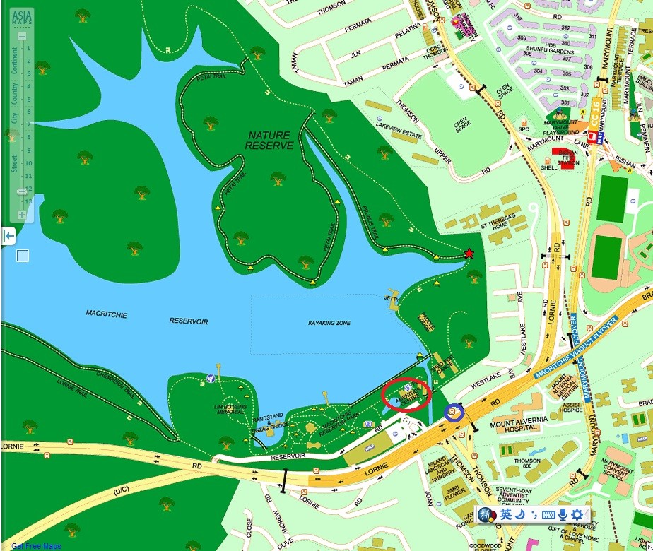 本周日10月19日下午1:00卖荔枝水库徒步,集合地点公园内的amenities centre(红圈)。最近的车站:Macritchie Reservoir bus stop (no. 51071,蓝圈),在lornie road和thomson road那块。Mary mount