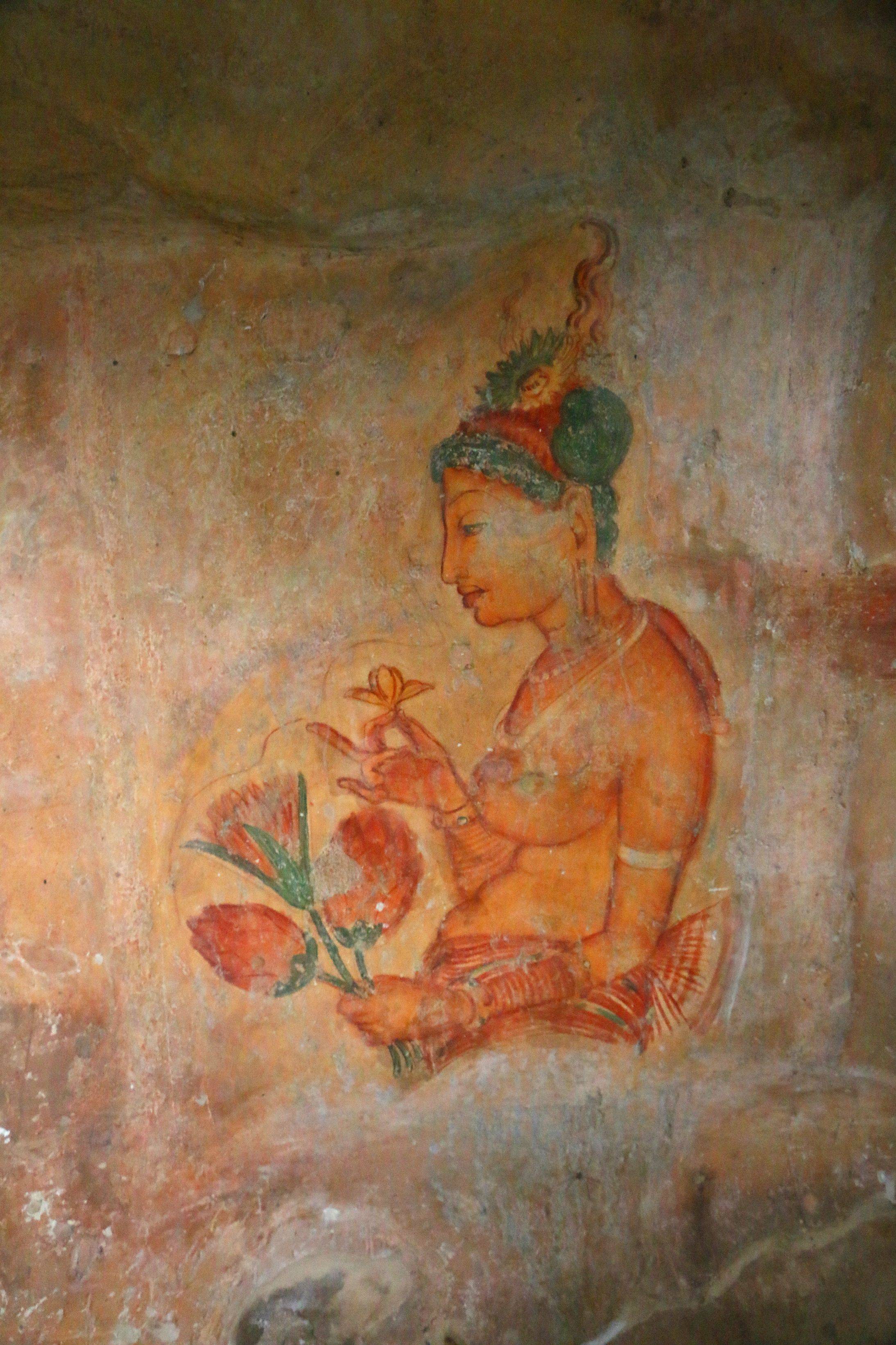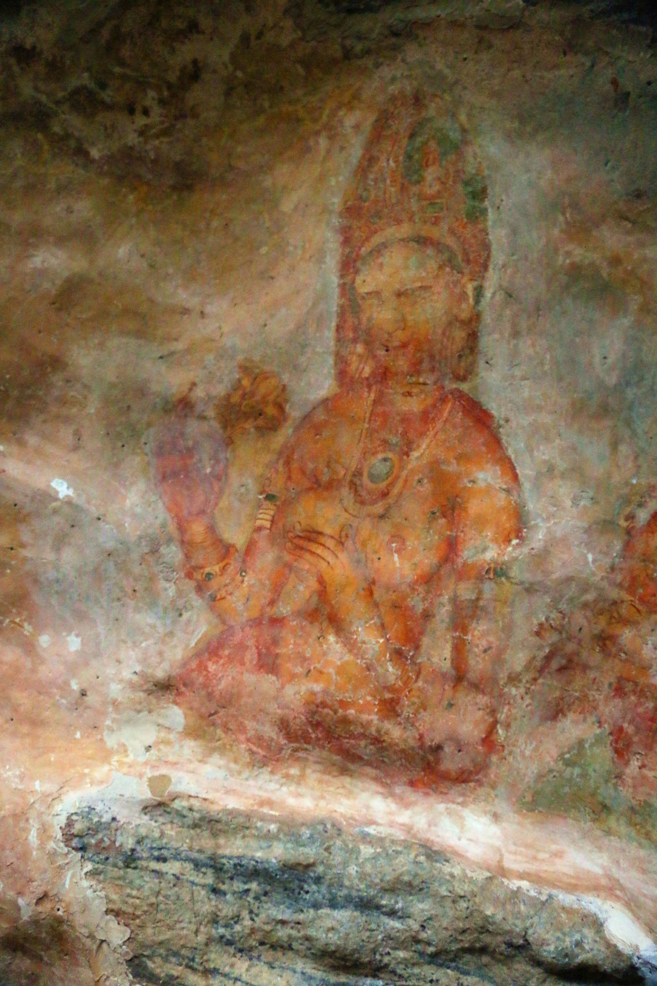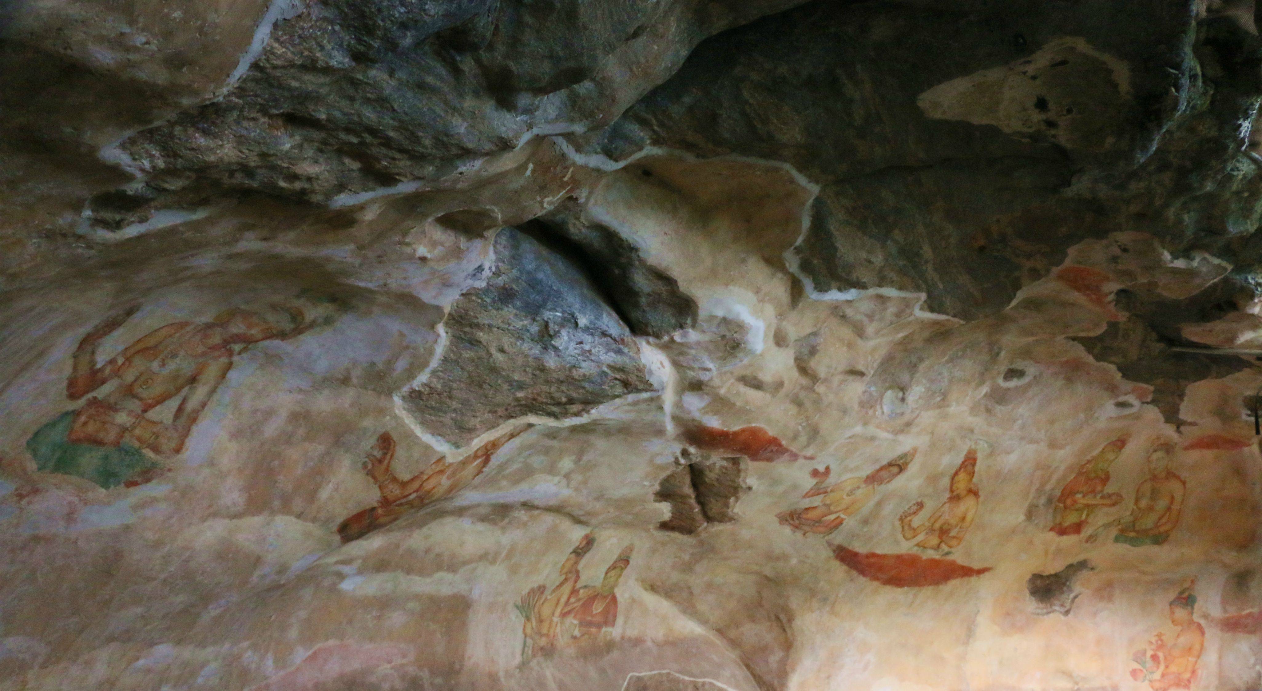 狮子岩中段橘色的部分是传说中的镜墙,右手侧就是观赏壁画的所在,历经千载依然留下鲜艳的色泽。不过整个洞窟内留下来的也不过二十多副,大部分已由雨打风吹去……