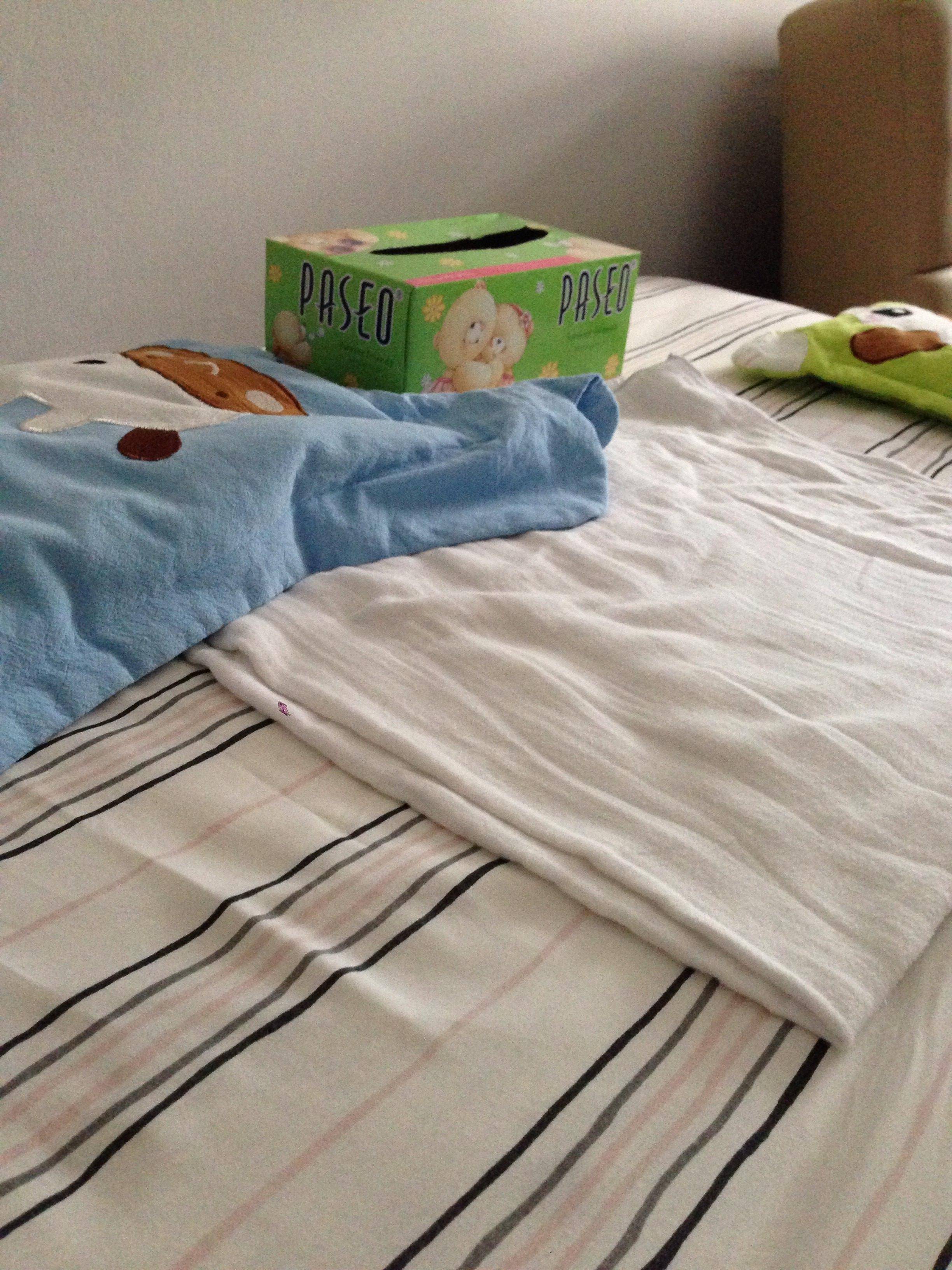 见下图,蓝色的枕头麻麻躺,白色的布宝宝枕在头下,上面是纸巾盒,旁边的绿枕头防止宝宝掉下去