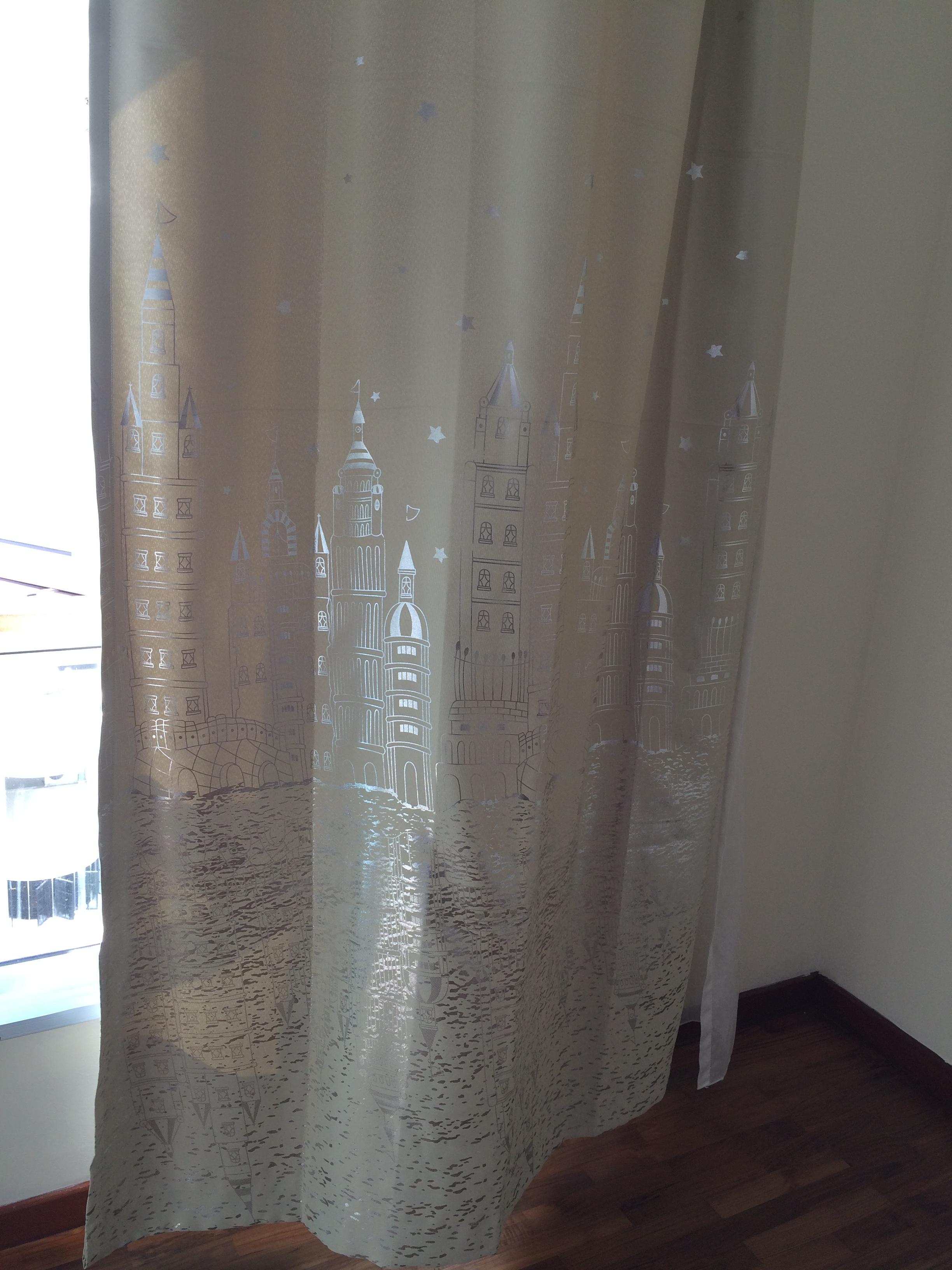 儿童窗帘这个没有那么遮光 但是好看 所以就下手啦,买窗帘要注意的是(如果自己买的话),要比实际宽度要宽一点点,因为楼主没有算上褶皱会消耗的宽度,所以,木有办法,自己把褶皱拆了,才能cover住整个窗户,还好不是特别影响美观