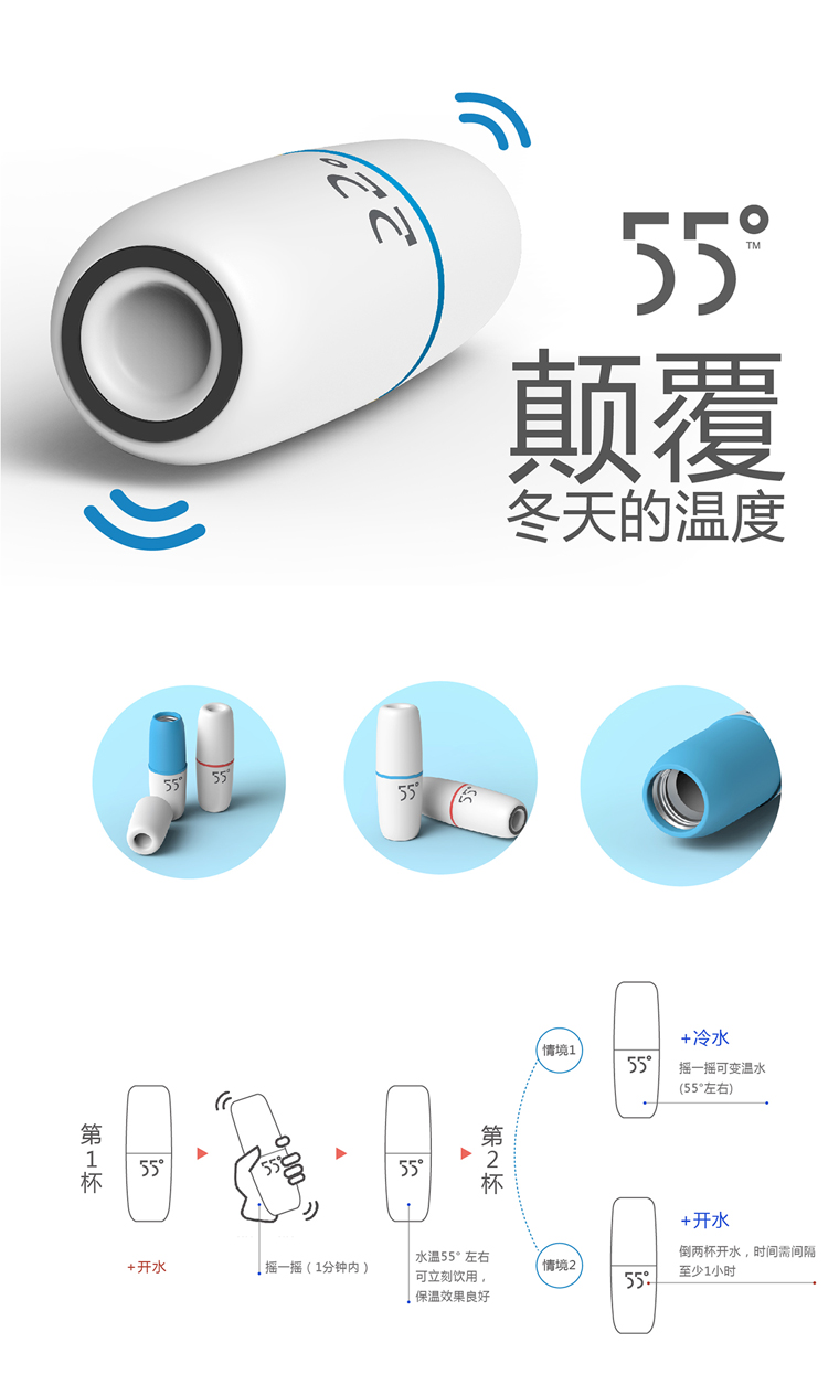 这个喝水神器:100摄氏度的开水倒入杯中,摇一摇(约1分钟),便可速降至55摄氏度左右的温水,可立即饮用,也可保温3小时;如果(第一杯)开水喝完后,第二杯再把凉水注入杯中,摇一摇,同样可快速升温至55摄氏度左右。摇一摇立刻能喝到舒适温水。