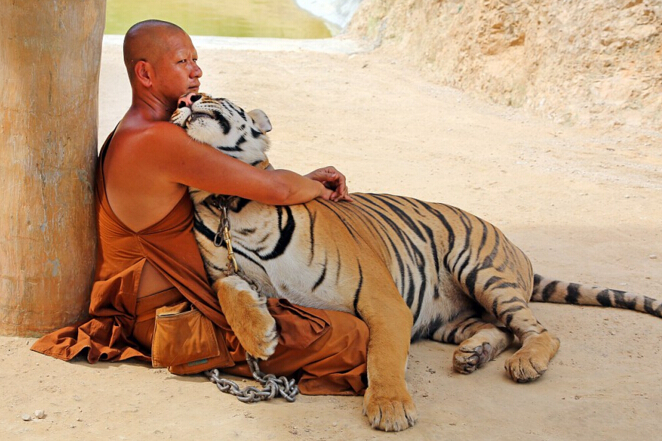 泰国北碧府(Kanchanaburi)的一个知名景点,靠着饲养上百只老虎吸引游客,因此被称为“老虎庙”。老虎庙的正式名称是帕朗塔布寺,是全球知名的以老虎为主题的旅游景点,在这里游客可以与老虎进行各种“亲密”活动:爱抚、喂食、游泳、遛虎以及拍照留念。老虎堪称老虎庙的金矿,每年可带来近300万美元的营收。