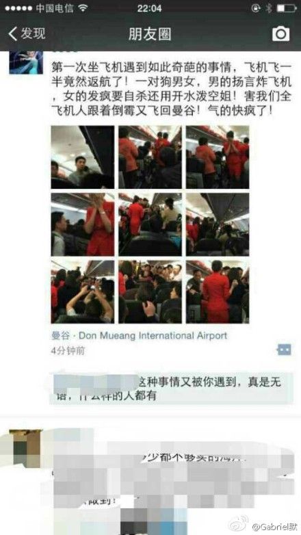 ,网友@主持人张潇爆料:两中国游客飞机上侮辱空姐,结果曼谷飞南京的航班,飞了一半又回曼谷。警察直接上飞机抓人,这叫丢人丢到国外了。今天FD9101起飞后,飞机上旅客打架,机组控制不住局面,返航曼谷,落地后更换机组,其他旅客也被迫下机。Ps:愿旅客平安回家…