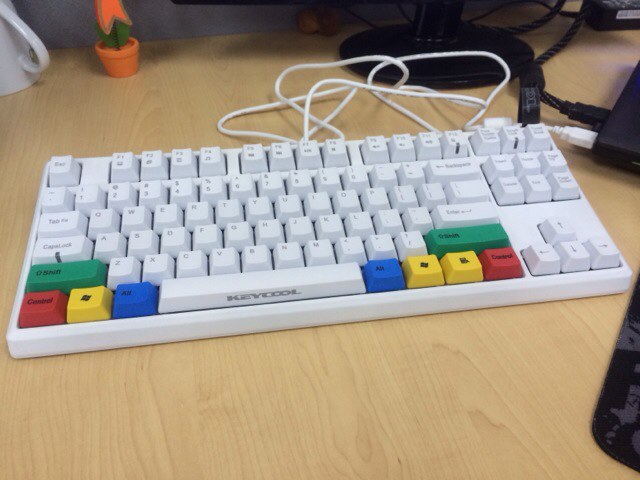 美!美!美!我之前在公司放了图上这把87键,黑轴;配了数字小键盘,青轴。但是很快就黄了TOT,换了钢厂的6G V2,黑轴过去。