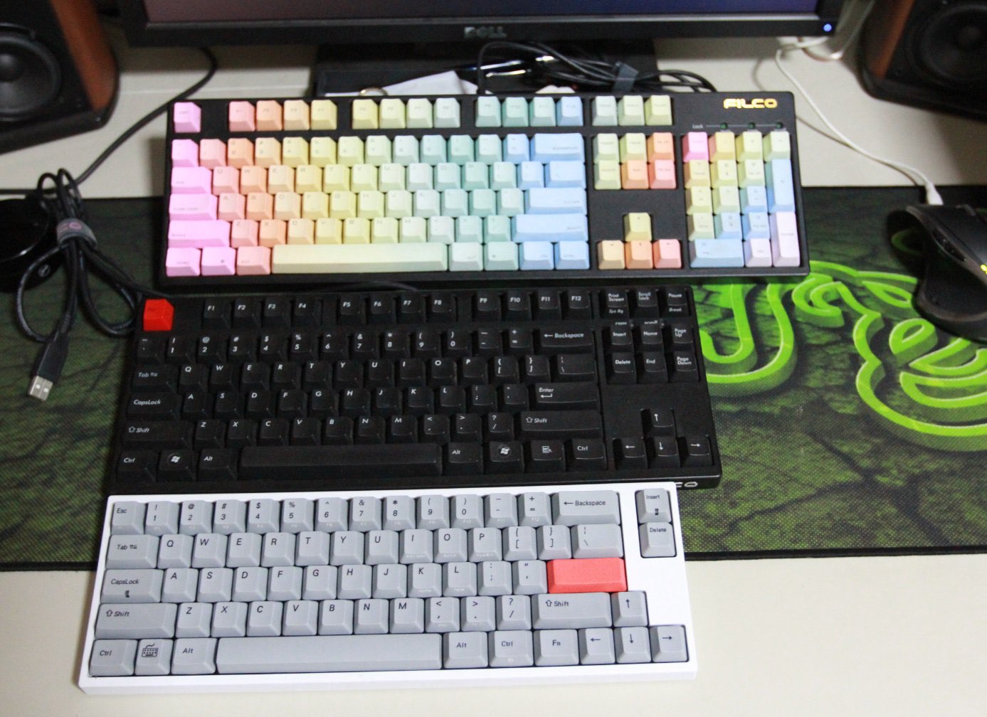 我之前在公司放了图上这把87键,黑轴;配了数字小键盘,青轴。但是很快就黄了TOT,换了钢厂的6G V2,黑轴过去。