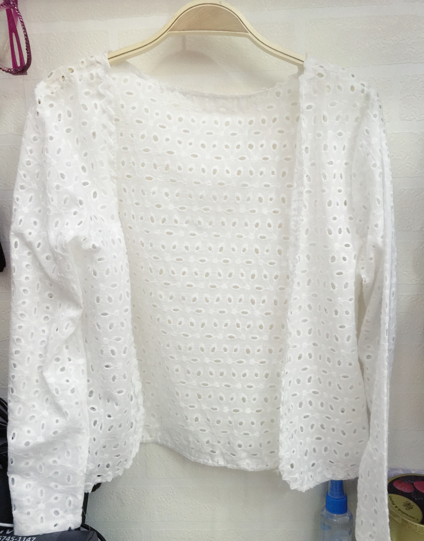 纯白色镂空无扣子开衫外套,质量很不错,纯棉质的,蛮有质感的,很好搭配,如果妹子有稍微露一点的衣服可以搭配外套来穿,好看收在包包里又不占地方,这件12<br>
